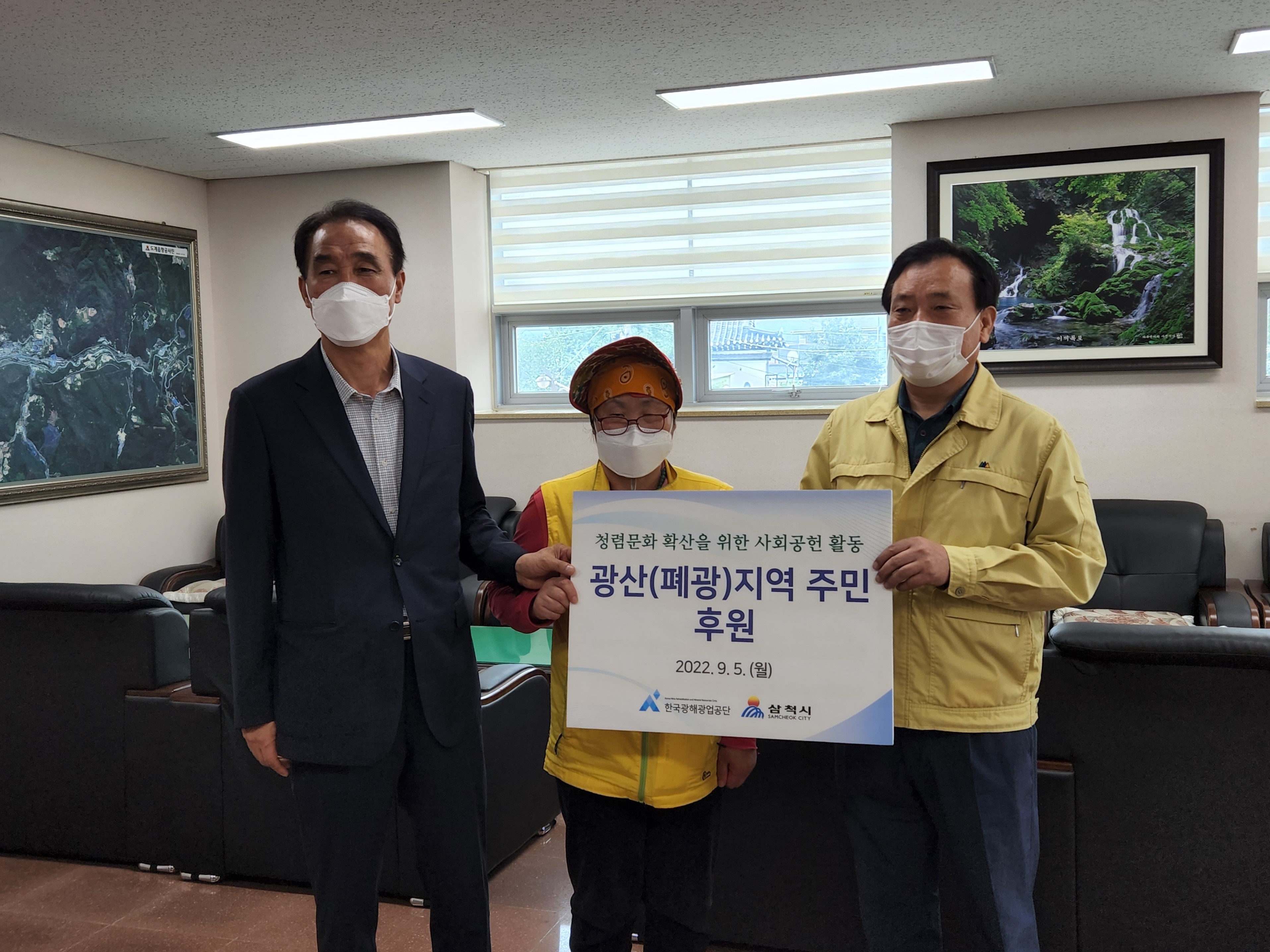 [강원사회복지신문 서은진 기자]=한국광해광업공단 감사실에서는 2022년 사회공헌활동의 일환인 '광산(폐광)지역 소외계층 후원사업'으로 지난 9월 5일 삼척시 도계읍행정복지센터를 방문하여 삼척시 도계읍 거주 노인과 아동 15가구에 4,500천 원 상당의 상품권을 전달하는 전달식을 가졌다.
