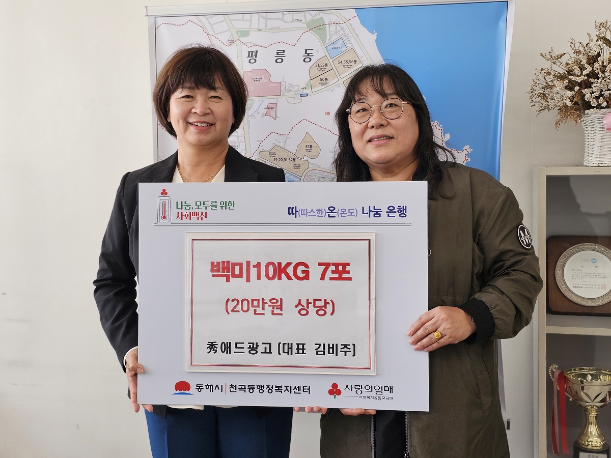 [강원사회복지신문 김종한 기자]=수애드 광고사(대표 김비주)는 지난 10월 10일 동해시 천곡동행정복지센터를 방문, 저소득 취약계층을 위한 백미 10kg 7포(20만원 상당)를 기탁했다.