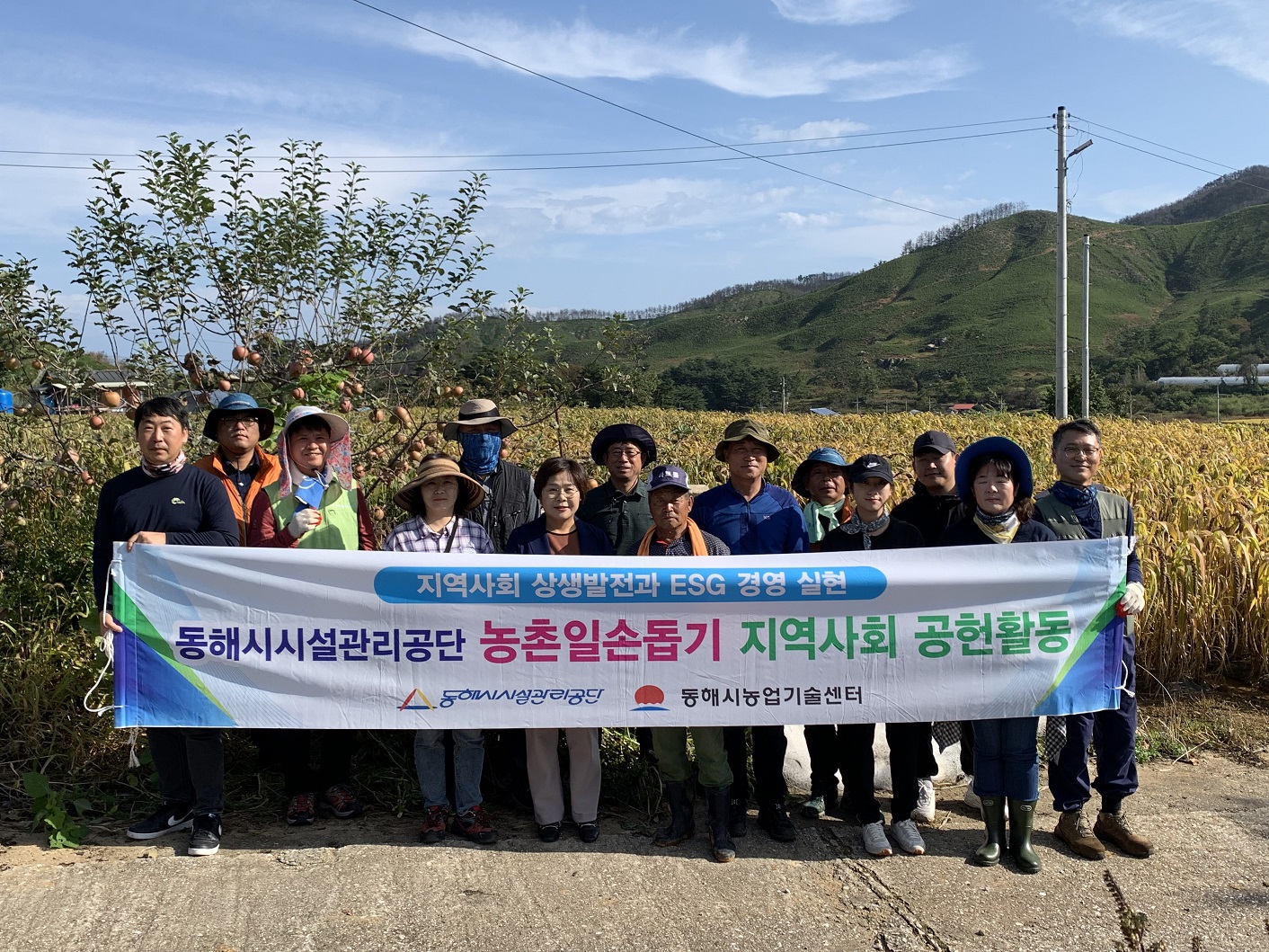 [강원사회복지신문 김종한 기자]=동해시시설관리공단(이사장 장해주) 농촌일손돕기 추진단은 지난 10월 11일 일손부족으로 어려움을 겪고 있는 만우동 농가를 방문하여 조(粟) 수확을 도왔다고 밝혔다. 동해시시설관리공단은 지난해 4월 동해시농업기술센터와 '농촌일손 돕기 협업 지역공헌사업 업무 협약'을 체결, 가을철 농...
