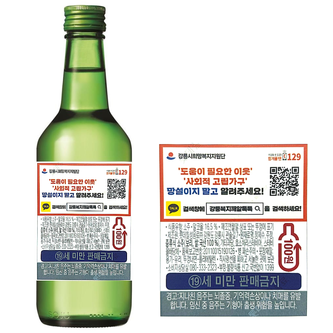 [강원사회복지신문 최재석 기자]=소주 '처음처럼' 30만 병 백라벨 홍보문구 부착 판매 강릉시는 롯데칠성음료(주)강릉공장(대표 윤현철)과 함께 고독사 예방을 위한 위기가구 및 사회적 고립가구 발굴·신고 캠페인을 실시한다. 롯데칠성음료(주)강릉공장은 10월부터 업소용 소주 '처음처럼' 30만 병에 '위기가구·사회적 고...