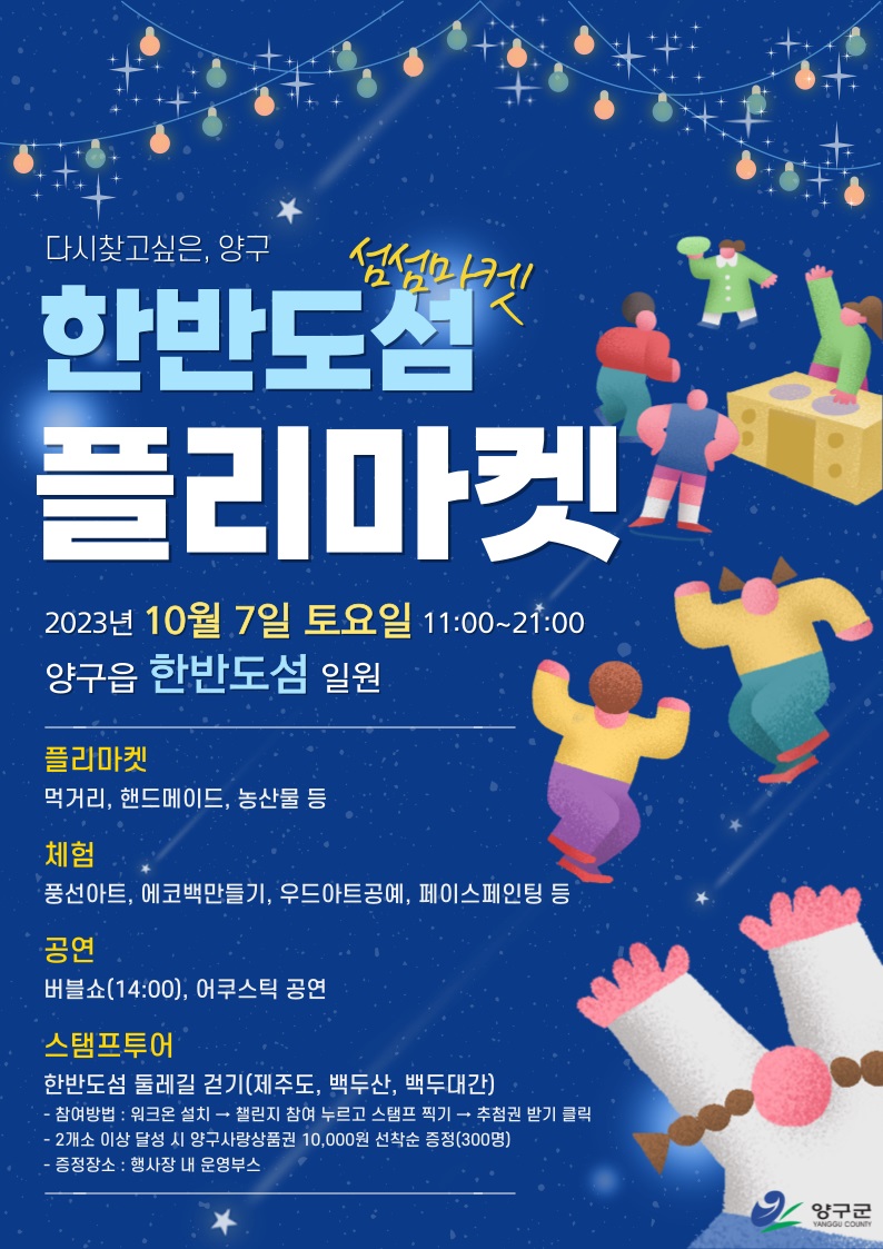 [강원사회복지신문 이정환 기자]=먹거리 및 공예품 판매, 에코백 만들기·페이스페인팅 등 체험 프로그램 등 스탬프 투어 챌린지 운영해 선착순 300명에게 양구사랑상품권 1만 원 증정 양구군은 지난 10월 7일 오전 11시부터 오후 9시까지 한반도섬 일원에서 플리마켓을 개최했다. 이번 행사는 지역 소상공인의 소득을 증대하...