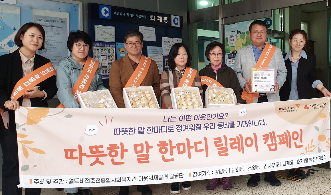 [강원사회복지신문 김도연 기자]=월드비젼춘천종합사회복지관(관장 신희경) 이웃의 재발견 발굴단은 지난 10월 4일 퇴계동행정복지센터(동장 이우찬)를 방문해 '따뜻한 말 한마디 릴레이 캠페인' 기념식 및 포춘쿠키 전달식을 했다. '따뜻한 말 한마디 릴레이 캠페인'은 포춘쿠키 안에 있는 문구를 이웃에게 전달해 이웃 간의...