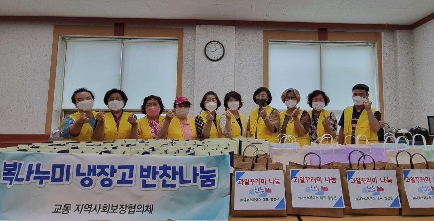[강원사회복지신문 홍기한 기자]=춘천시 교동 지역사회보장협의체(위원장:박남숙)는 지난 8월 9일 교동행정복지센터(동장:김춘옥)에 직접 준비한 반찬과 나누스페이스(대표:엄정은)가 후원한 과일꾸러미 30개를 전달했다.