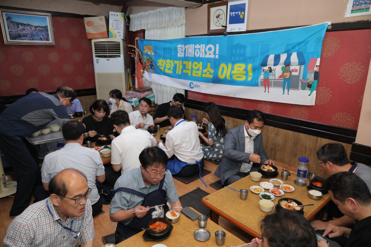 [강원사회복지신문 이정환 기자]=육동한 춘천시장은 지난 8월 8일 민생경제를 살리기 위해 민생경제 범대책위원회의 종료 후 회의에 참석한 회원들과 함께 후평동에 있는 착한가격업소에서 오찬을 하는 등 착한가격업소를 적극 이용하기로 결의했다.