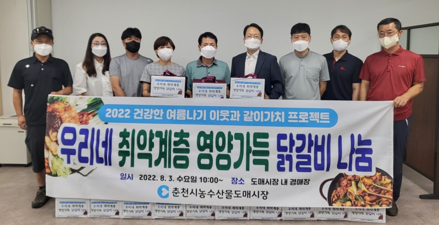 [강원사회복지신문 김종한 기자]=춘천시농수산물도매시장 내 소상공인은 지난 8월 3일 지역 내 취약계층을 위한 1㎏ 닭갈비 100박스(160만원 상당)를 춘천시 신사우동 행정복지센터(동장:한희정)에 전달했다. 이번 기부는 코로나19 피해지원 시설임대료 감면 혜택에 따른 감사의 인사를 전하기 위해 마련됐다. 도매시장 내 소...