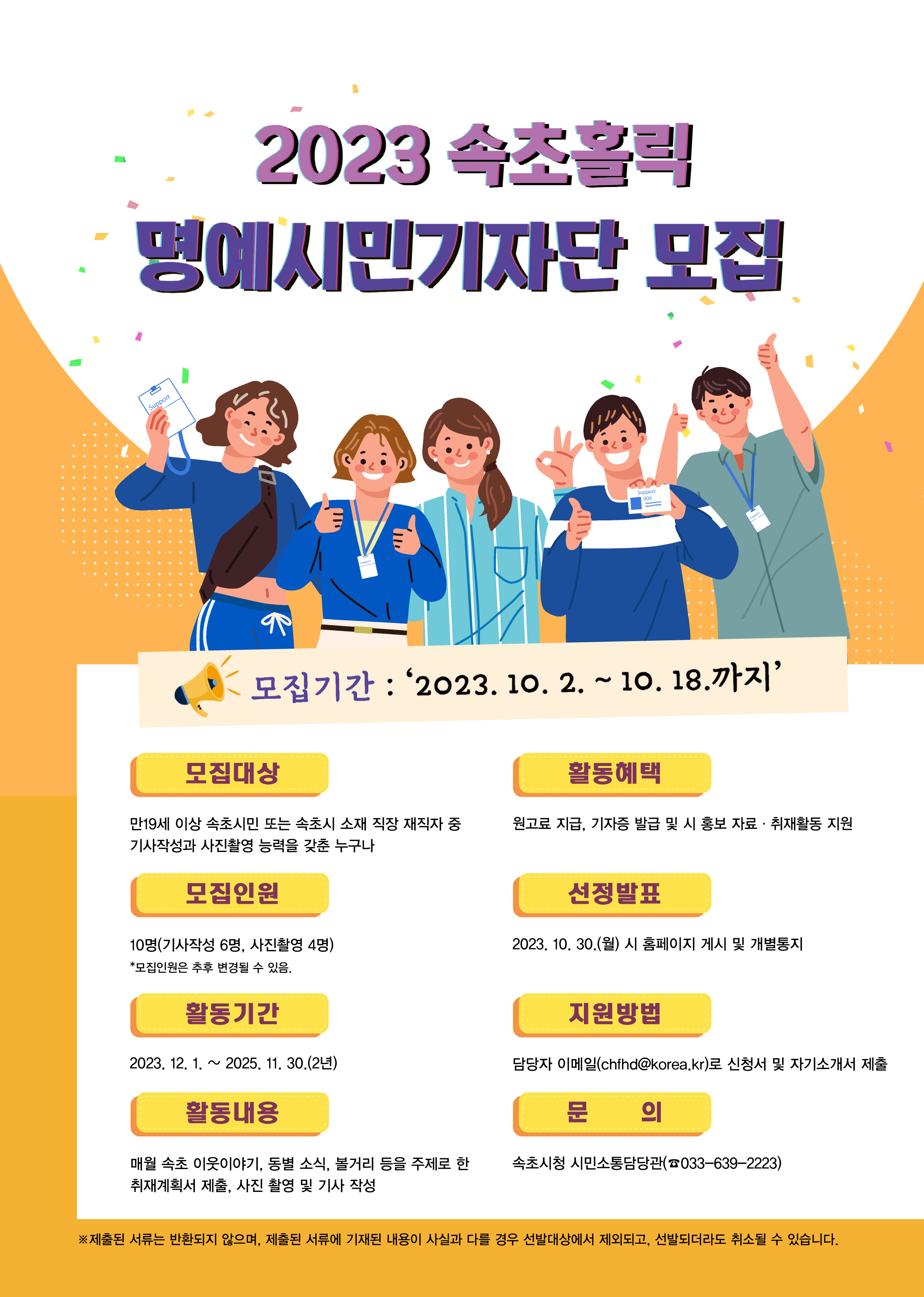 [강원사회복지신문 김도연 기자]=시민 참여형 소식지 제작으로 시민 눈높이 시정 콘텐츠 구현 속초시가 시 승격 60주년을 맞아 시정소식지 '속초홀릭'을 이끌어갈 명예시민기자를 오는 10월 18일까지 모집한다. 명예시민기자는 12월부터 2025년 11월까지 2년 동안 속초시 곳곳의 다양한 소식을 직접 취재하며 마을 소식, 이웃...
