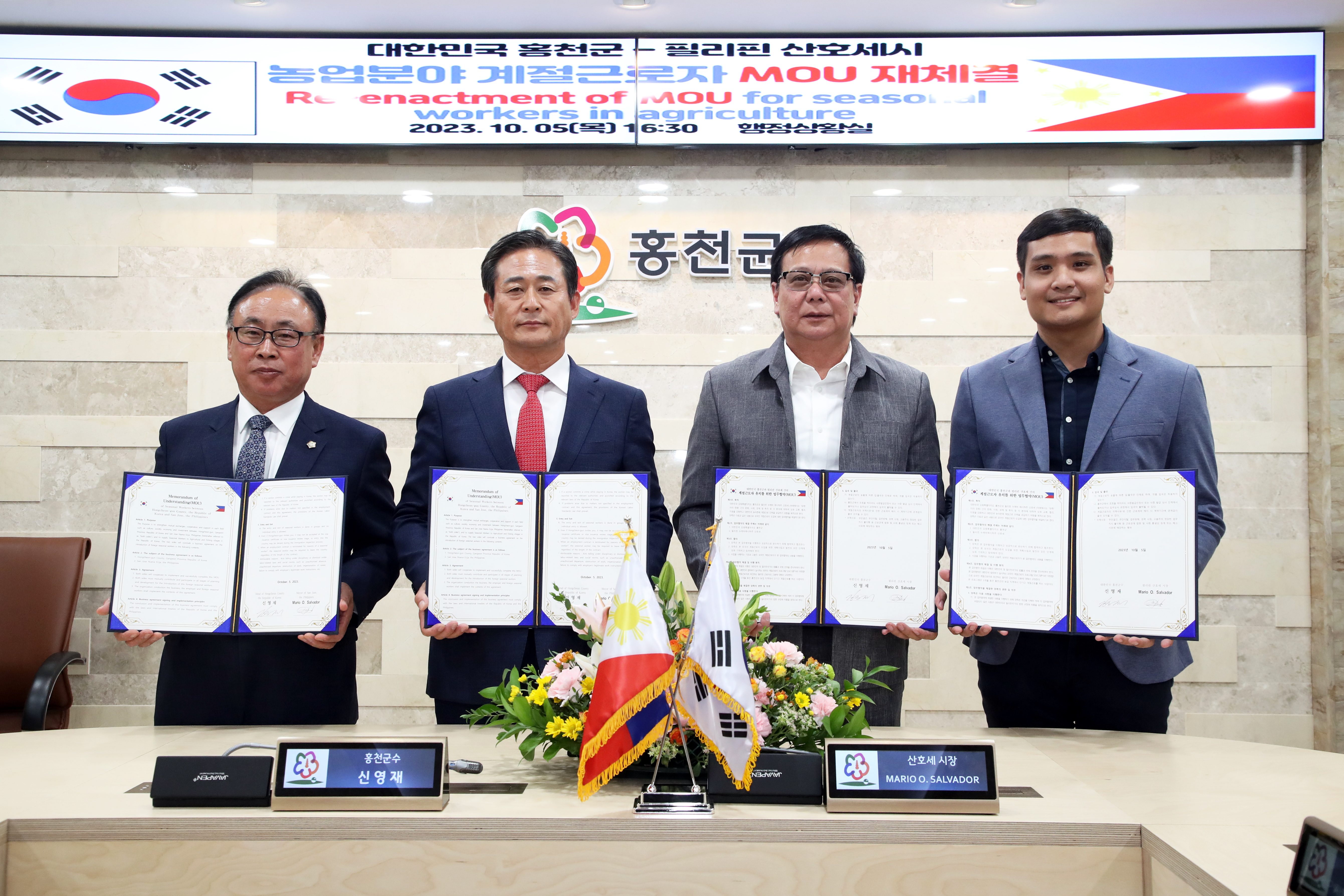 [강원사회복지신문 최재석 기자]=필리핀 산호세 마리오 살바도르시장 및 관계자 18명이 지난 10월 5일 법무부의 체류기간 확대 발표에 따른 기간연장을 위한 새로운 MOU 체결을 위해 홍천군에 방문했다. 산호세는 2023년 홍천군에 계절근로자를 처음으로 보낸 지자체로 이번 MOU재체결을 통해 외국인 계절근로자 체류기간을 ...