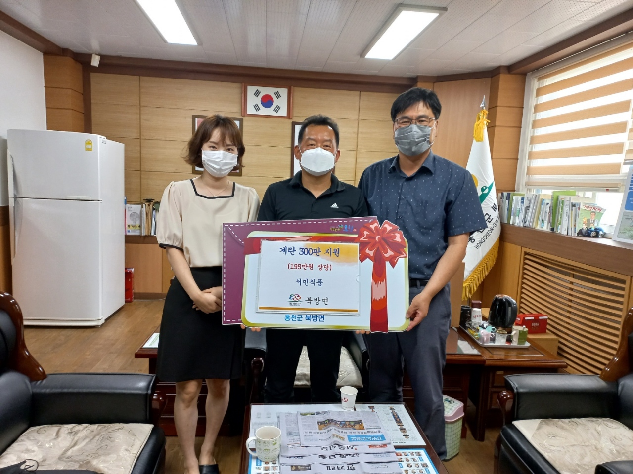 [강원사회복지신문 서은진 기자]=홍천군 북방면 서민식품(대표 박현선)은 지난 8월 1일 북방면 행정복지센터를 방문, 195만원 상당의 계란 300판을 기탁했다. 기탁된 후원물품은 북방면 내 사회복지시설에 전달될 예정이다. 서민식품은 꾸준히 후원물품을 전달하며, 사회공헌 활동을 적극 실천하고 있다.