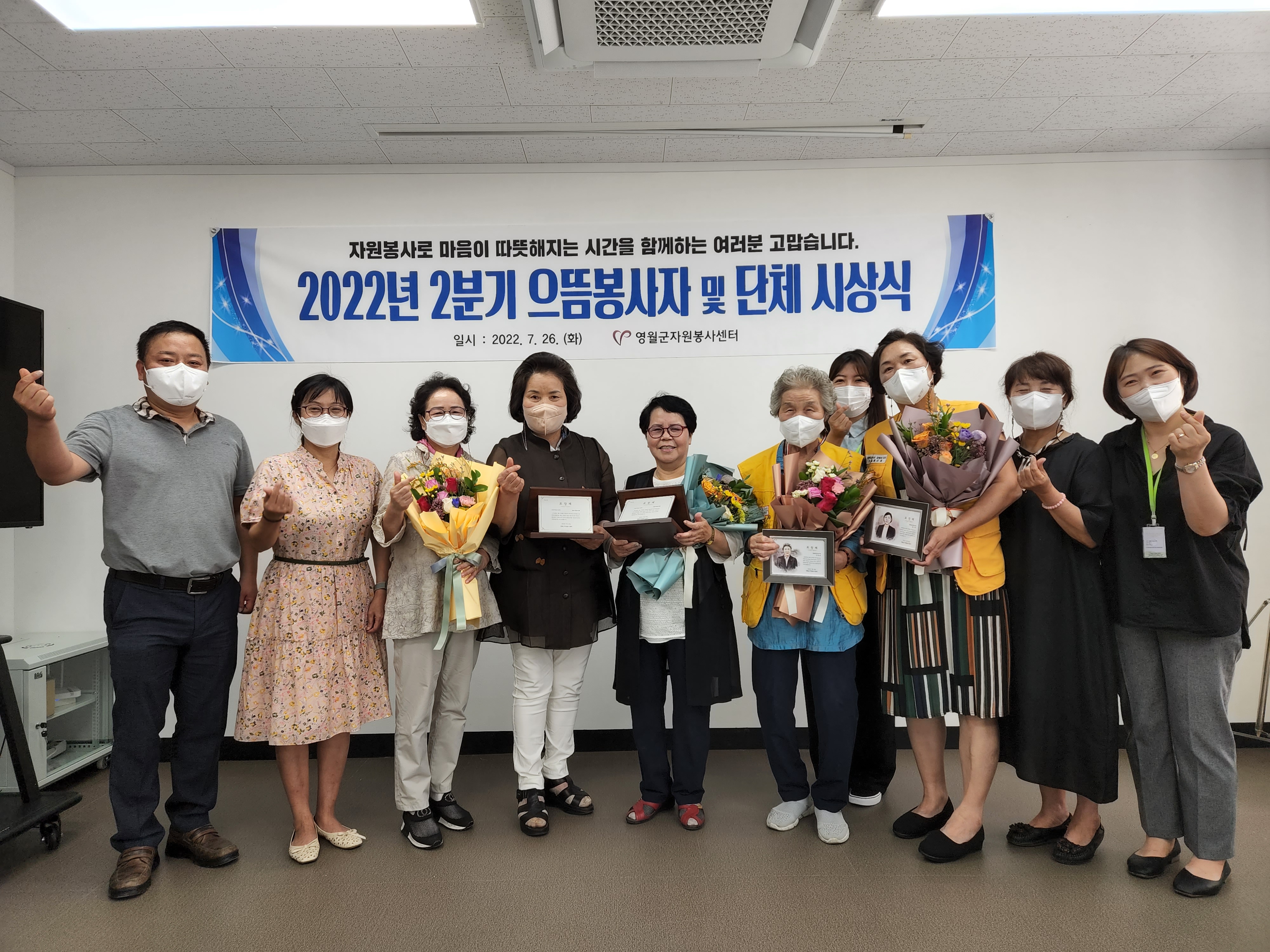 [강원사회복지신문 이정환 기자]=영월군자원봉사센터는 지난 7월 26일 2022년 2분기 으뜸봉사자 및 으뜸단체에 대한 시상식을 개최했다. 으뜸봉사자에는 3월 발생한 영월 대형 산불 진화에 힘을 보태고 지역내 홀로어르신을 위해 반찬조리 및 구호물품 전달등 다양한 봉사활동에 적극 참여한 봉사자 김혜숙, 정기자, 신동분님...