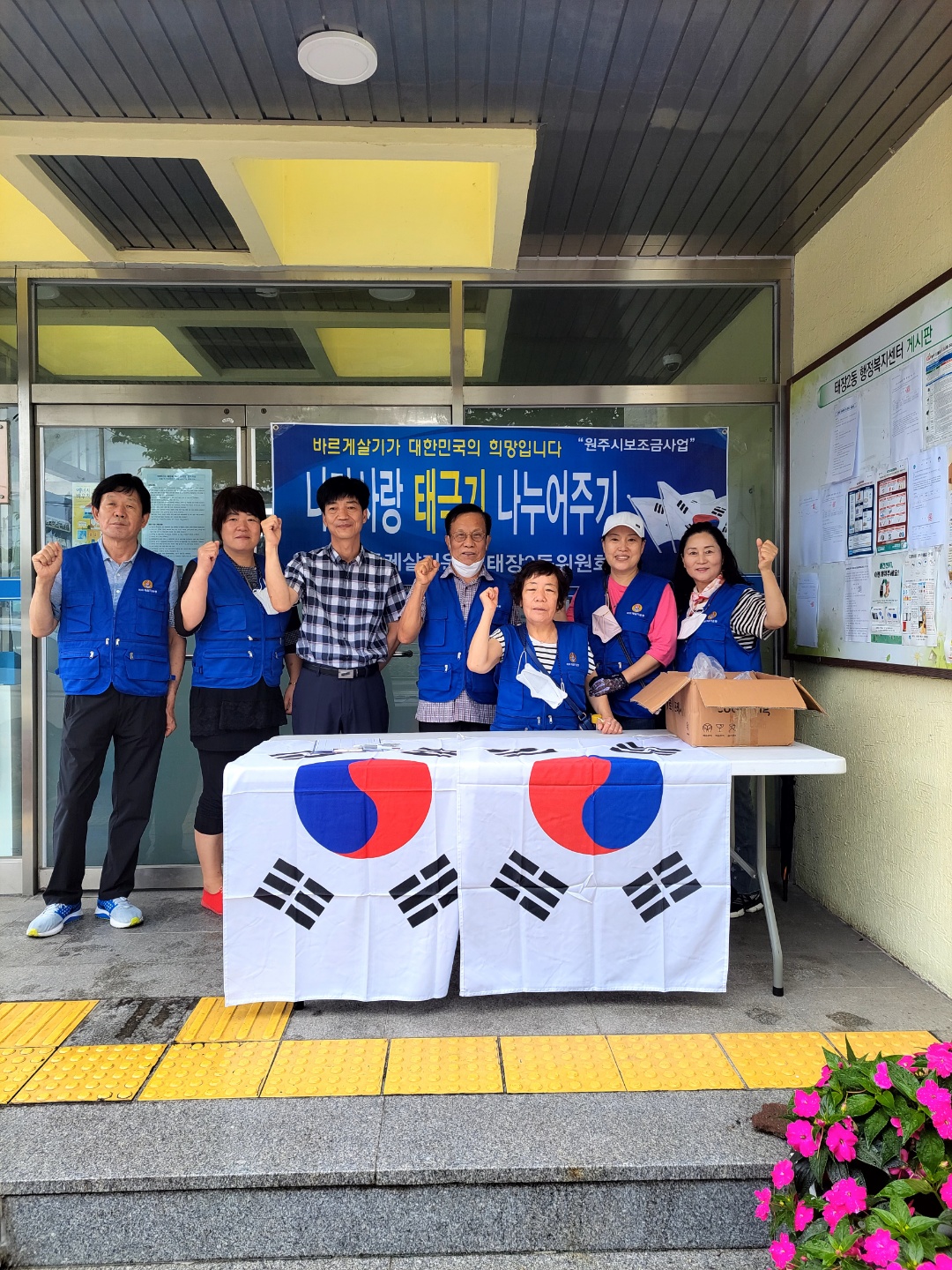 [강원사회복지신문 서은진 기자]=원주시 태장2동 바르게살기위원회(위원장 최돈수)는 지난 7월 21일 태장2동 행정복지센터에서 '나라사랑 태극기 나눔 행사'를 열었다. 회원들은 태극기 게양의식을 높이기 위해 회비 등을 모아 태극기를 마련하고 주민들에게 무료로 나눠줬다. 최돈수 바르게살기위원장은 "국경일에 태극기를...