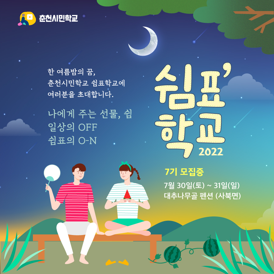 [강원사회복지신문 홍기한 기자]=쉼과 전환이 필요한 춘천시민을 위한 <7기 쉼표학교> (재)춘천시 마을자치지원센터는 오는 7월 30-31일 춘천시민을 대상으로 1박 2일 동안 진행되는 <7기 쉼표학교> 참가자를 모집한다. 쉼표학교는 '일상을 벗어나 쉼 속에서 나를 돌아보고 삶의 전환을 고민하는 인생학교'로서 ...