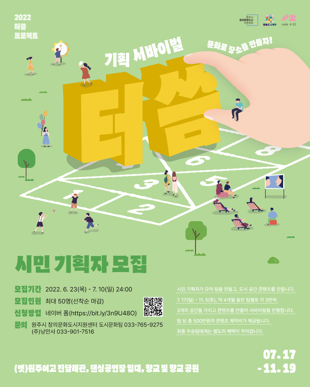 [강원사회복지신문 서은진 기자]=원주시 창의문화도시지원센터(센터장 제현수)는 2022년 원주스타일 도시문화 구축사업으로 터씀 프로젝트 '기획 서바이벌 터씀'의 시민기획자를 오는 7월 11일까지 모집한다. 터씀 프로젝트는 원주의 터를 멋지게 써본다는 의미로, '기획 서바이벌 터씀'은 시민 기획자가 모여 도시 공간 3곳...