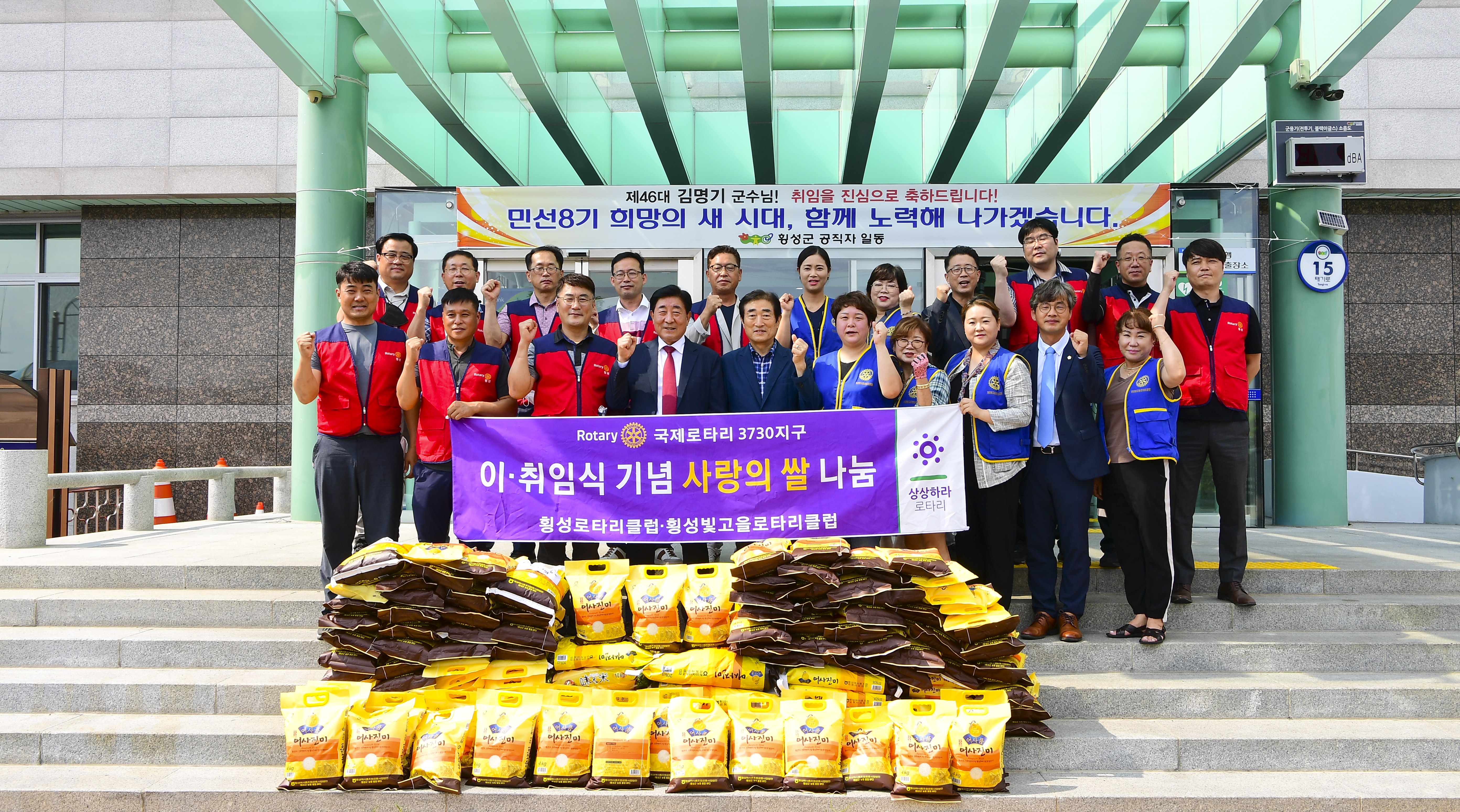 [강원사회복지신문 홍기한 기자]=횡성로타리클럽(회장 김기성)과 횡성빛고을로타리클럽(회장 김연화)은 지난 7월 4일 오후 3시, 횡성군청 군수집무실을 방문하여 백미 600kg(1,731천원 상당)을 '횡성행복나눔성금'에 기탁하였다. 전달식에는 김명기 횡성군수를 비롯해 이석원 횡성군사회복지협의회장, 횡성로타리클럽 회장 김...