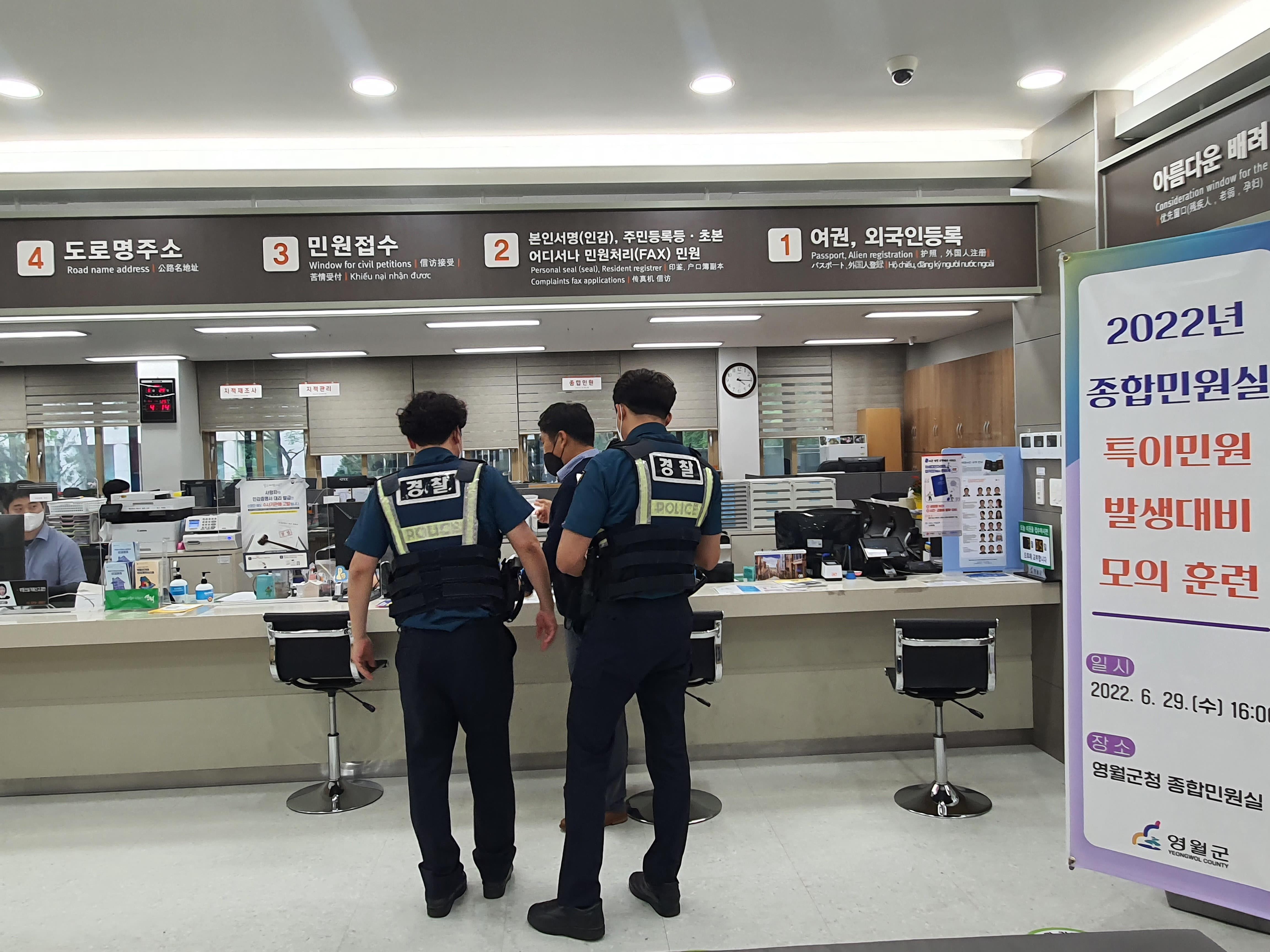 [강원사회복지신문 이정환 기자]=영월군은 지난 6월 29일 영월군청 종합민원실에서 민원업무처리 중 폭언.폭행 등특이민원 발생대비 모의훈련을 실시 했다. 이번 훈련은 최근 민원공무원을 대상으로 점차 늘어나고 있는 예상치 못한 상황 등에 적절히 대응하기 위해 지휘통제반, 초기대처반, 민원인 대비유도반, 피해공무원보...