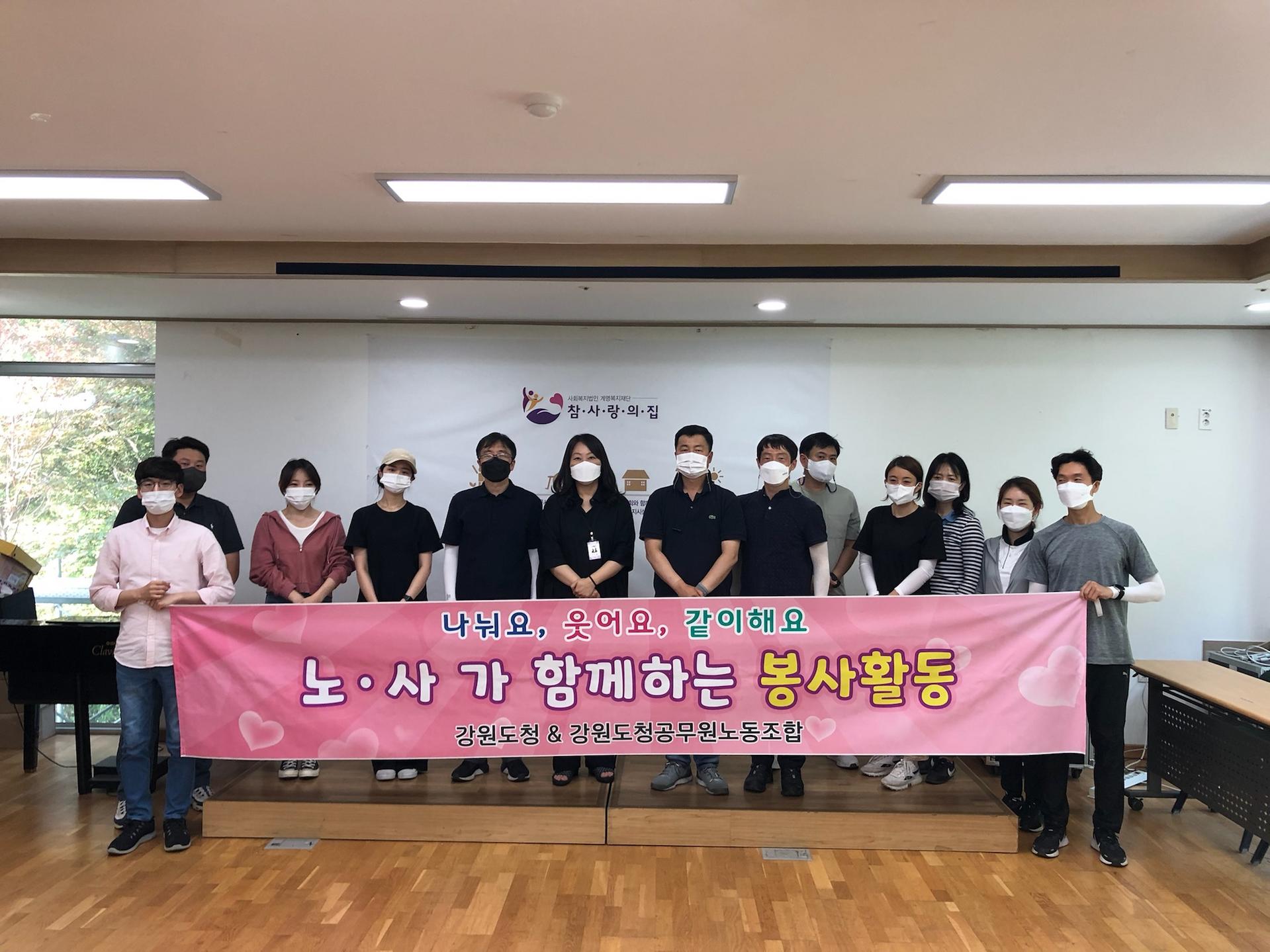 [강원사회복지신문 서은진 기자]=지난 6월 21일 춘천시 신북읍에 위치한 춘천 참사랑의집 방문 환경정화 등 봉사활동과 생필품(쌀, 휴지 등) 전달 강원도청 공무원노사는 지난 6월 21일(화) 춘천시 신북읍에 위치한 '참사랑의 집'을 찾아 봉사활동을 실시했다. 노조위원장, 총무행정관실 직원 등 16명은 시각장애인 시설인 '...