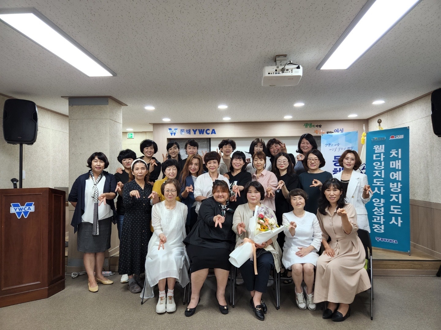 [강원사회복지신문 홍기한 기자]=동해YWCA(사무총장 금후자)에서는 2022년도 강원도 지역·산업맞춤형 일자리 창출 지원사업인 '치매예방지도사&웰다잉지도사 양성과정' 수료식이 동해YWCA 3층 대강당에서 진행되었다. 강원도와 동해시의 예산을 지원받아 취업 의지가 확고한 미취업자를 대상으로 훈련생을 선발하여 '치...