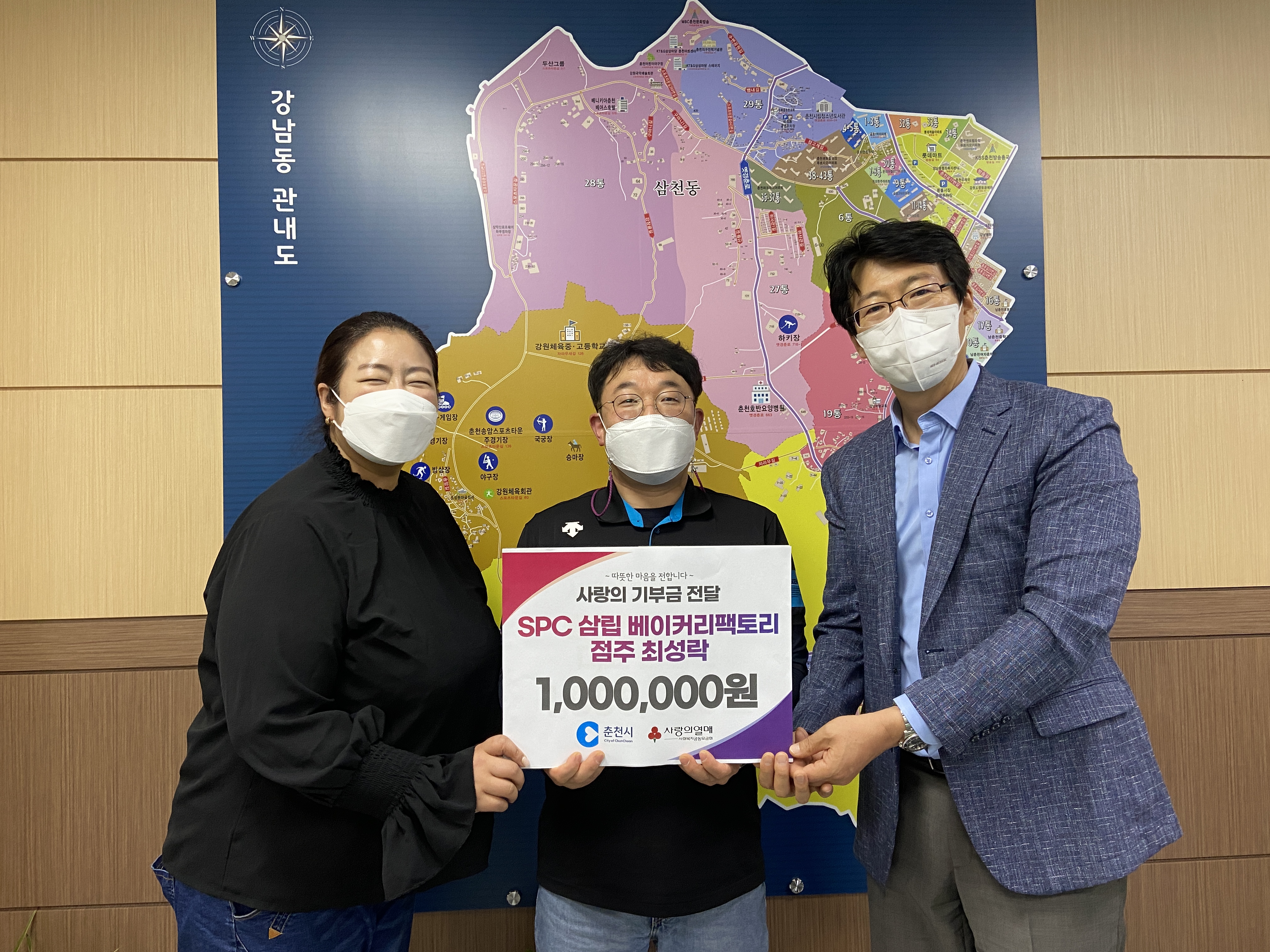 [강원사회복지신문 이정환 기자]=SPC삼립 베이커리팩토리(점주:최성락)는 지난 6월 16일 춘천시 강남동 행정복지센터를 방문해 성금 100만원을 전달했다.