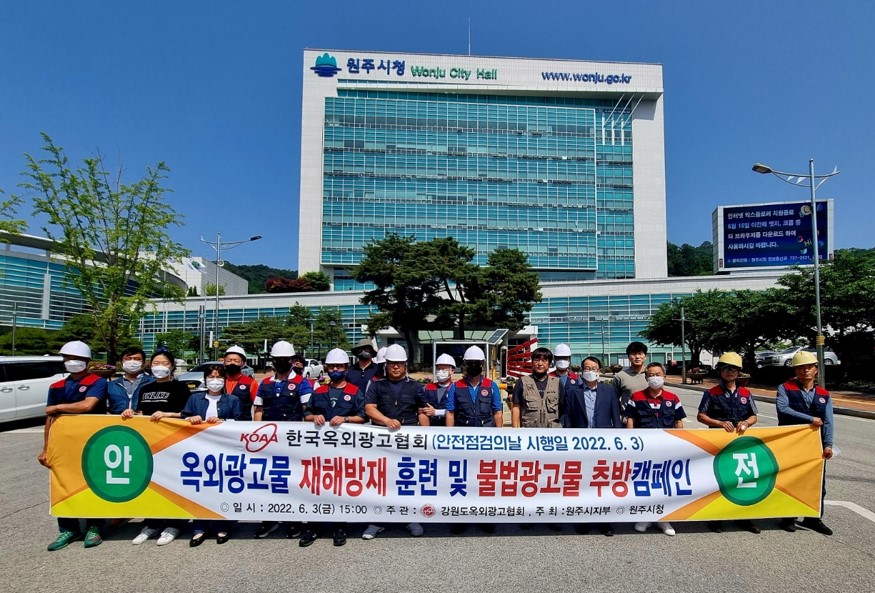 [강원사회복지신문 홍기한 기자]=원주시는 지난 6월 3일 시청 앞에서 (사)강원도옥외광고협회 원주시지부(지부장 이학명) 회원 및 옥외광고물 재해방재단, 시청 광고물팀 등 30여 명이 참석한 가운데 전국 동시에 개최하는 '옥외광고물 안전점검의 날' 행사를 열었다. 이날 행사에서는 옥외광고물 재해방재 훈련과 불법 광고...