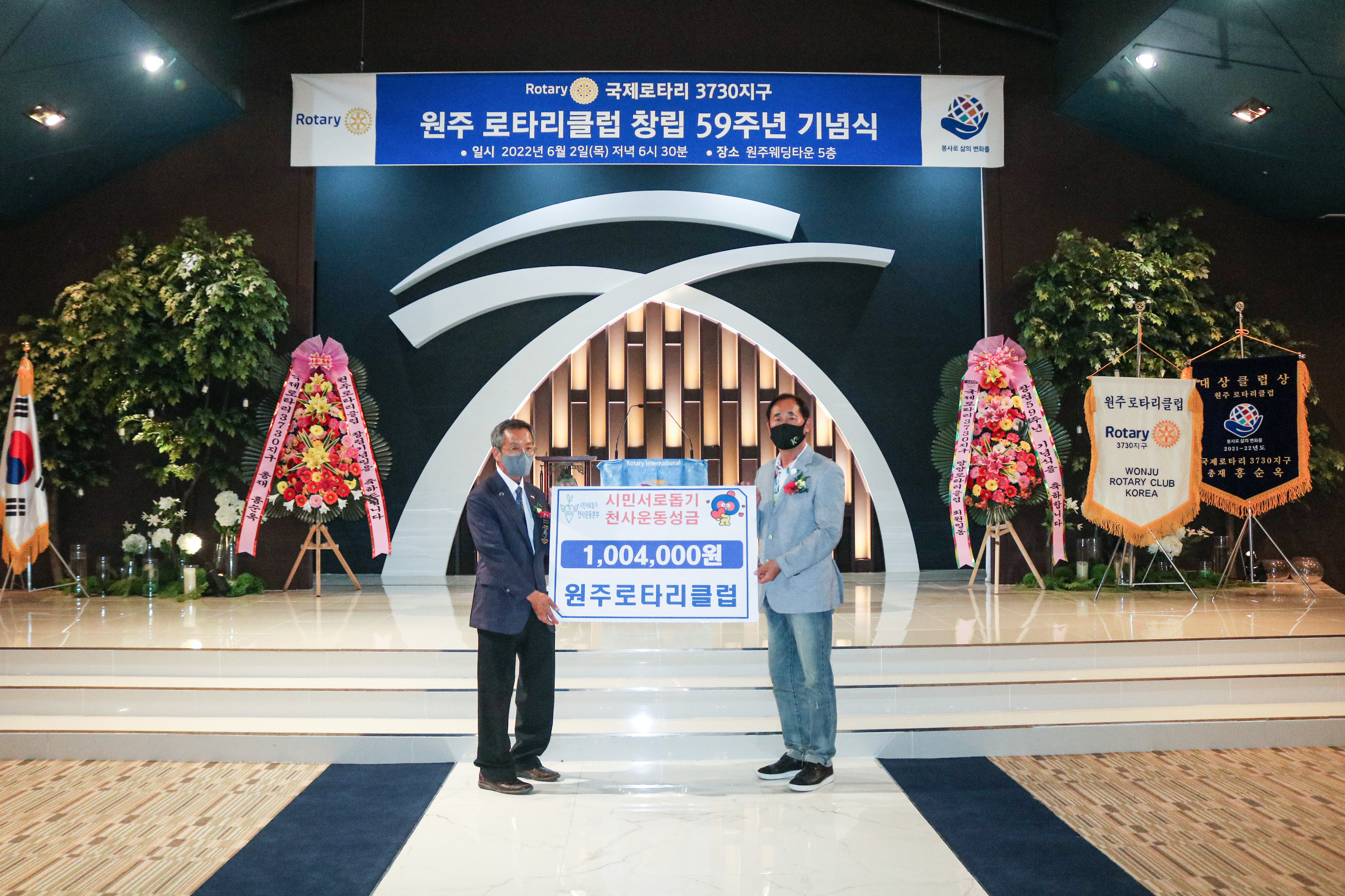[강원사회복지신문 서은진 기자]=원주로타리클럽(회장 박태순)은 지난 6월 2일 창립 59주년 기념식(원주웨딩타운)에서 시민서로돕기 천사운동 후원금(1,004,000원)을 전달했다. 전달식에는 원주로타리클럽 박태순 회장 및 회원(총 97명), 지은희 시민서로돕기 천사운동본부장, 김길선 천사지킴이 회장이 참석했다. 박태순 회...