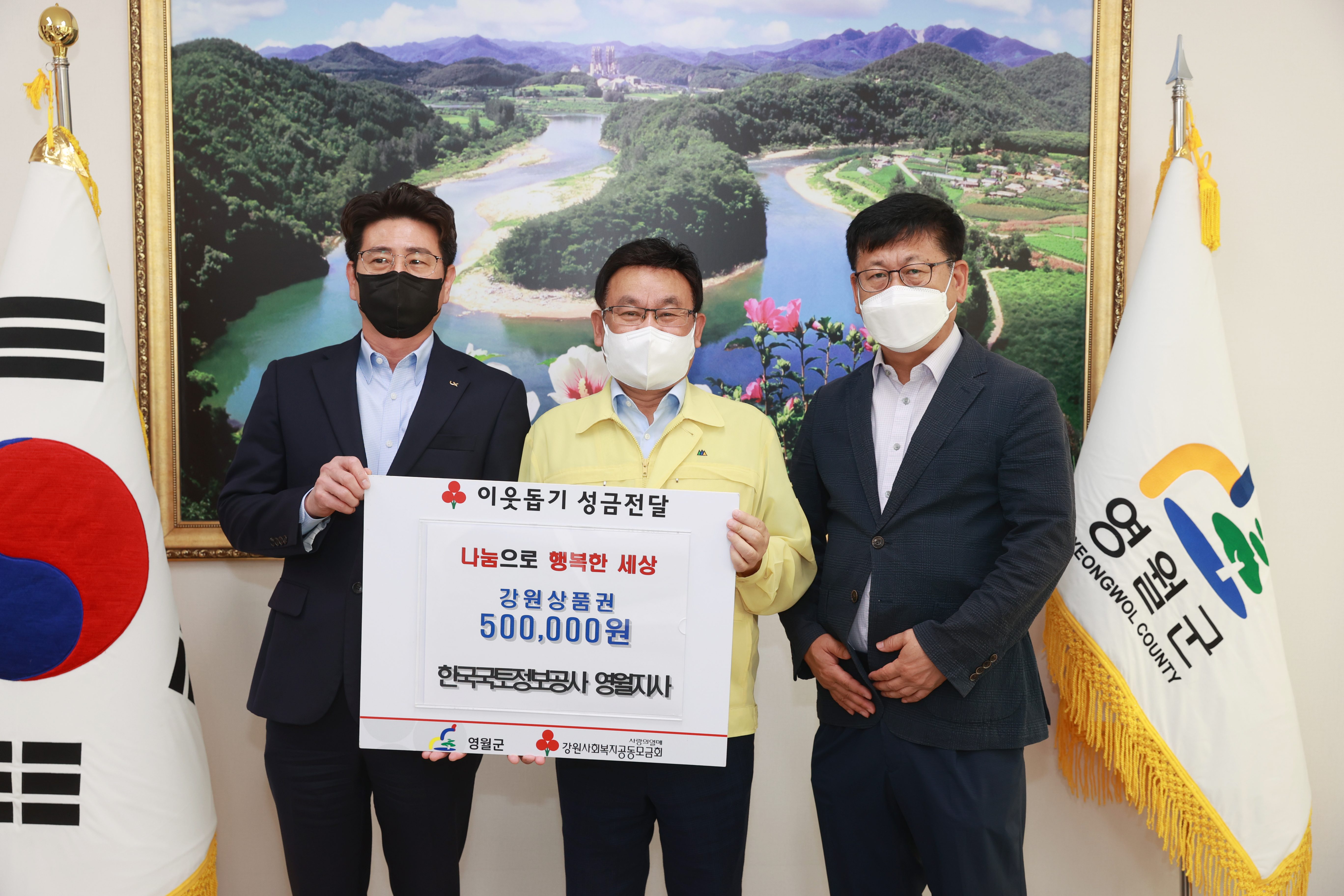 [강원사회복지신문 홍기한 기자]=한국국토정보공사 영월지사(지사장 정태원)는 가정의 달을 맞이해 관내 어려운 이웃을 위해 써달라며 강원상품권 50만원을 기탁했다. 한국국토정보공사 영월지사는 올해뿐만 아니라 지난 해에도 취약계층을 위해 상품권 50만원을 기탁한 바 있으며, 꾸준히 지역사회를 위한 나눔 활동에 동참...