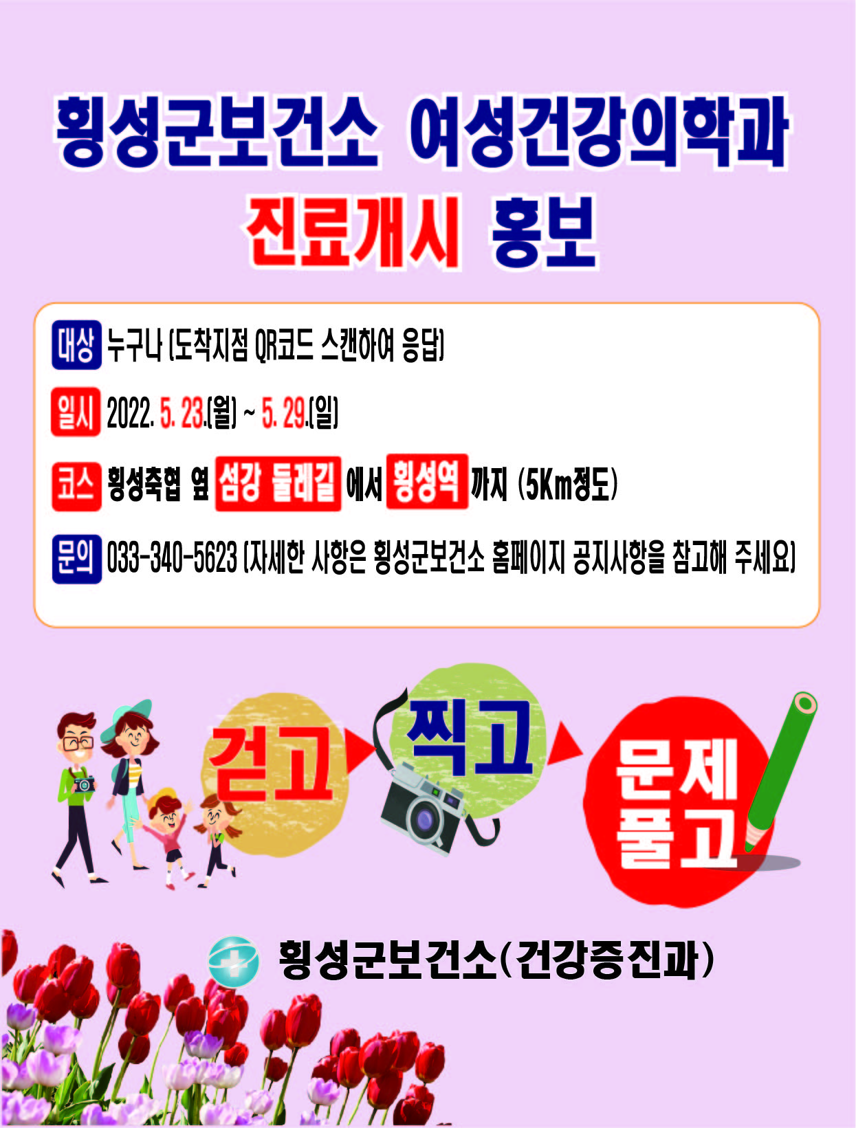 [강원사회복지신문 서은진 기자]=걷고! 찍고! 문제 풀고! 5월 23일부터 29일까지 횡성군보건소는 여성건강의학과 진료 개시 홍보와 더불어, 여성암이나 부인과 질환에 대한 잘못된 상식을 바로잡고 정기적인 검진을 유도하고자 5월 23일부터 29일까지 홍보 이벤트를 진행한다. 횡성군민이면 기간 내 누구나 참여할 수 있으며...