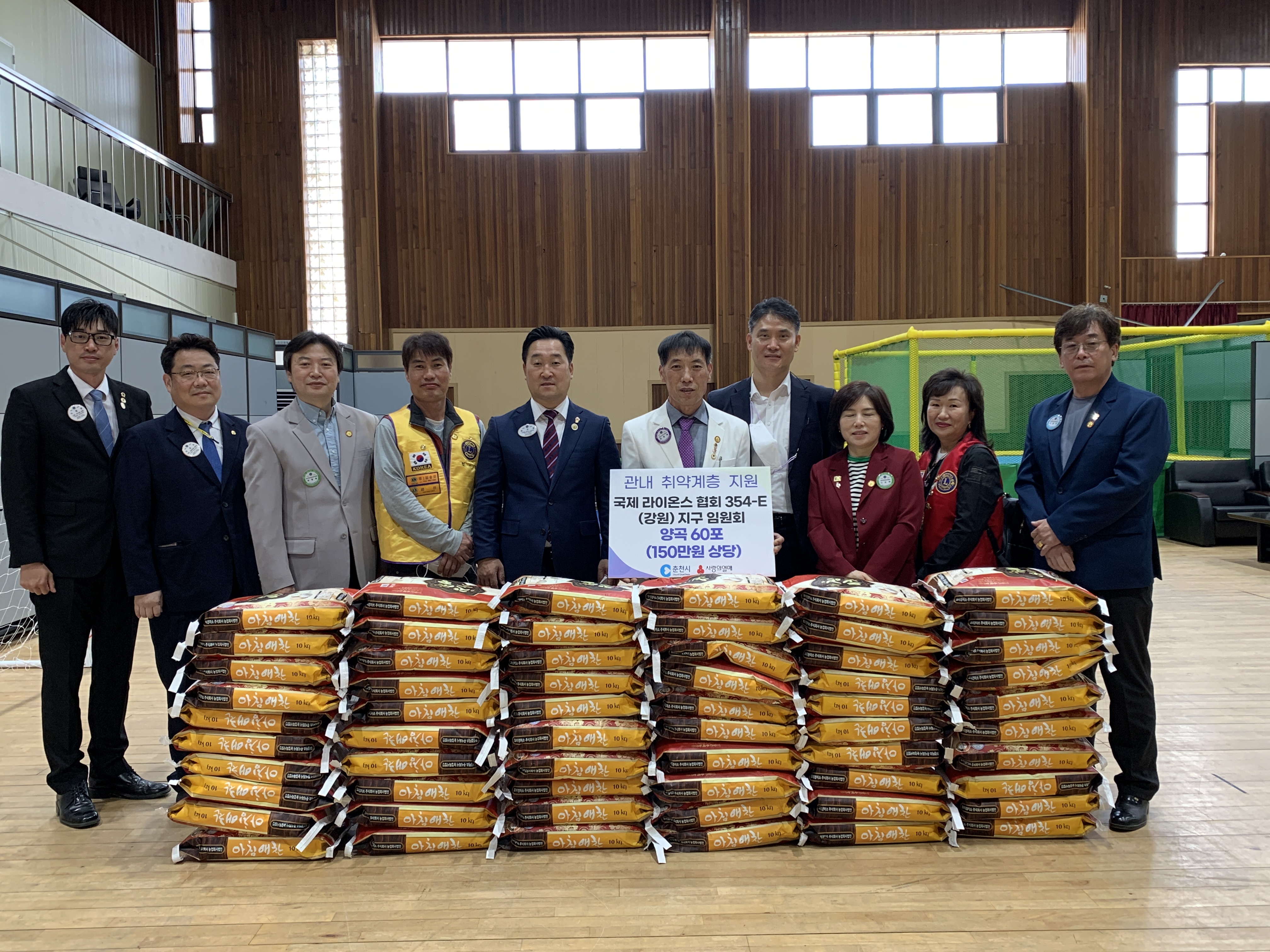 [강원사회복지신문 서은진 기자]=국제 라이온스 협회 354-E (강원)지구 임원회는 춘천시청 복지정책과에 방문해 150만원 상당의 양곡 60포를 전달했다.