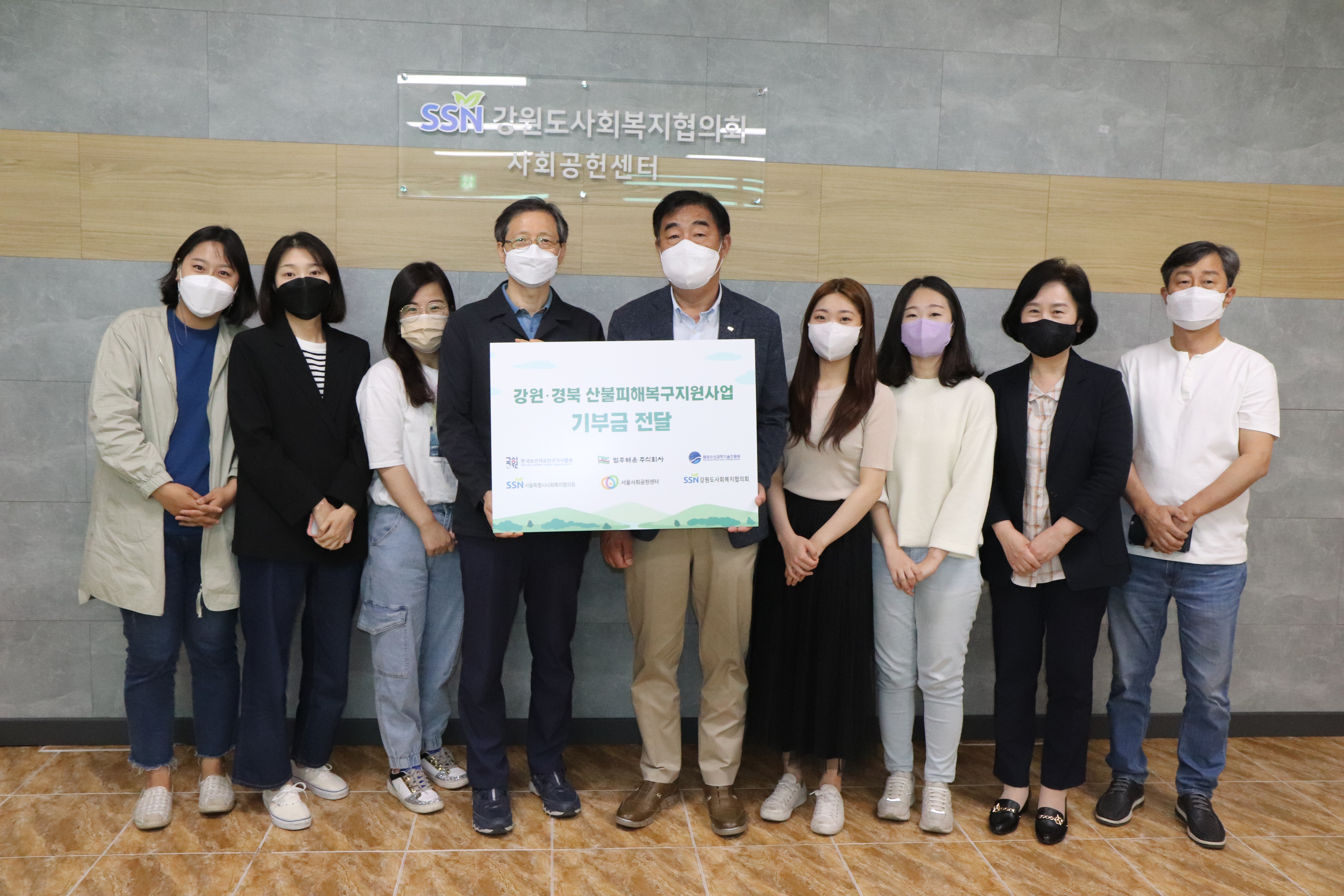 [강원사회복지신문 이정환 기자]=서울특별시사회복지협의회(회장 김현훈)는 지난 5월 11일 오전 11시 강원도사회복지협의회(회장 홍기종)를 통해 강원도 산불 피해 지역에 성금 6,000천원을 기탁하여 강원도사회복지협의회 사무처에서 전달식을 가졌다. 이날 전달식에는 서울시사회복지협의회 사무총장 전명수, 강원사회복지...