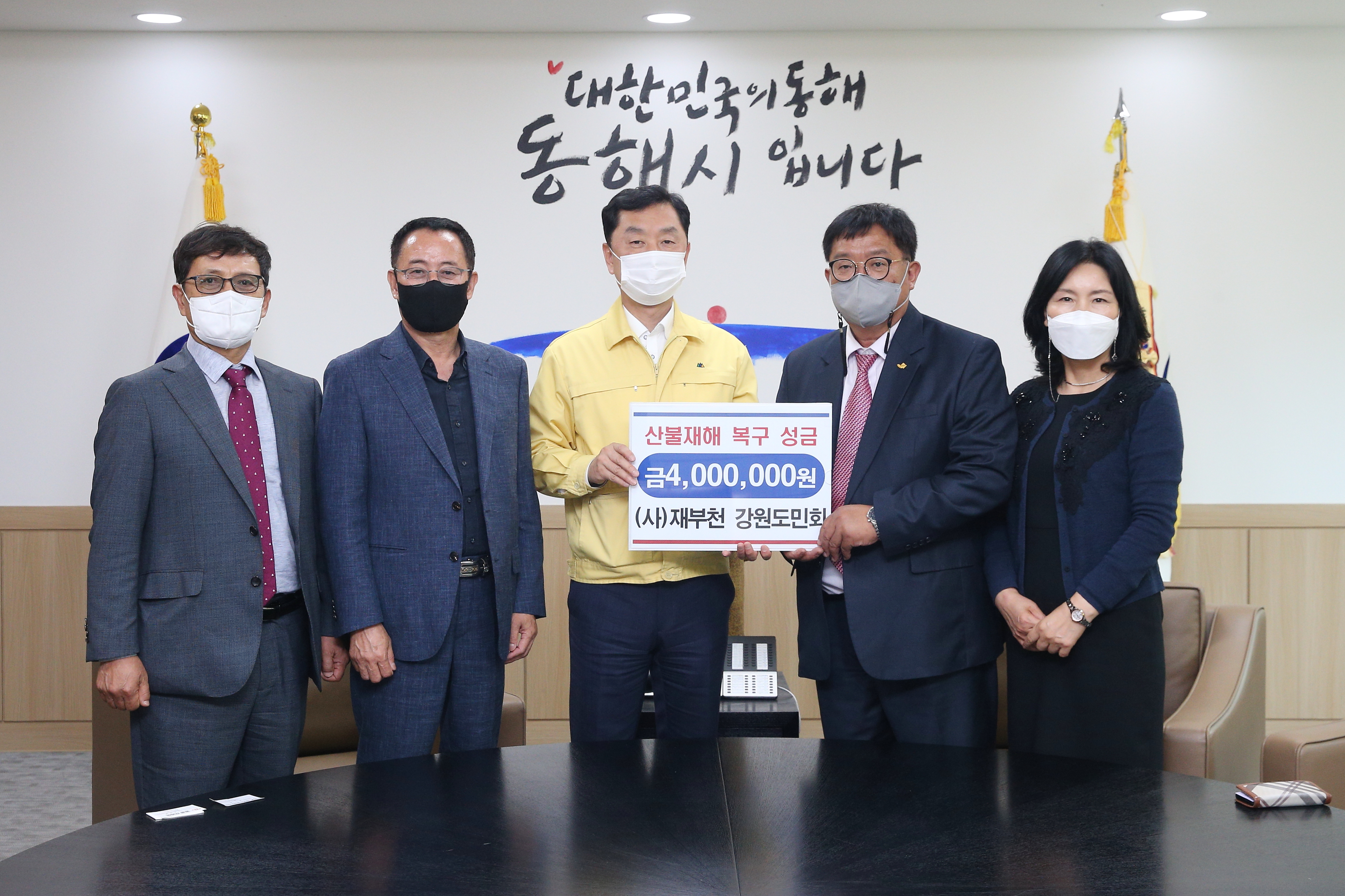 [강원사회복지신문 서은진 기자]=(사)재부천 강원도민회에서 지난 5월 11일 동해시청을 방문해 산불재해 복구를 위해 사용해 달라며 400만원의 성금을 기탁했다.