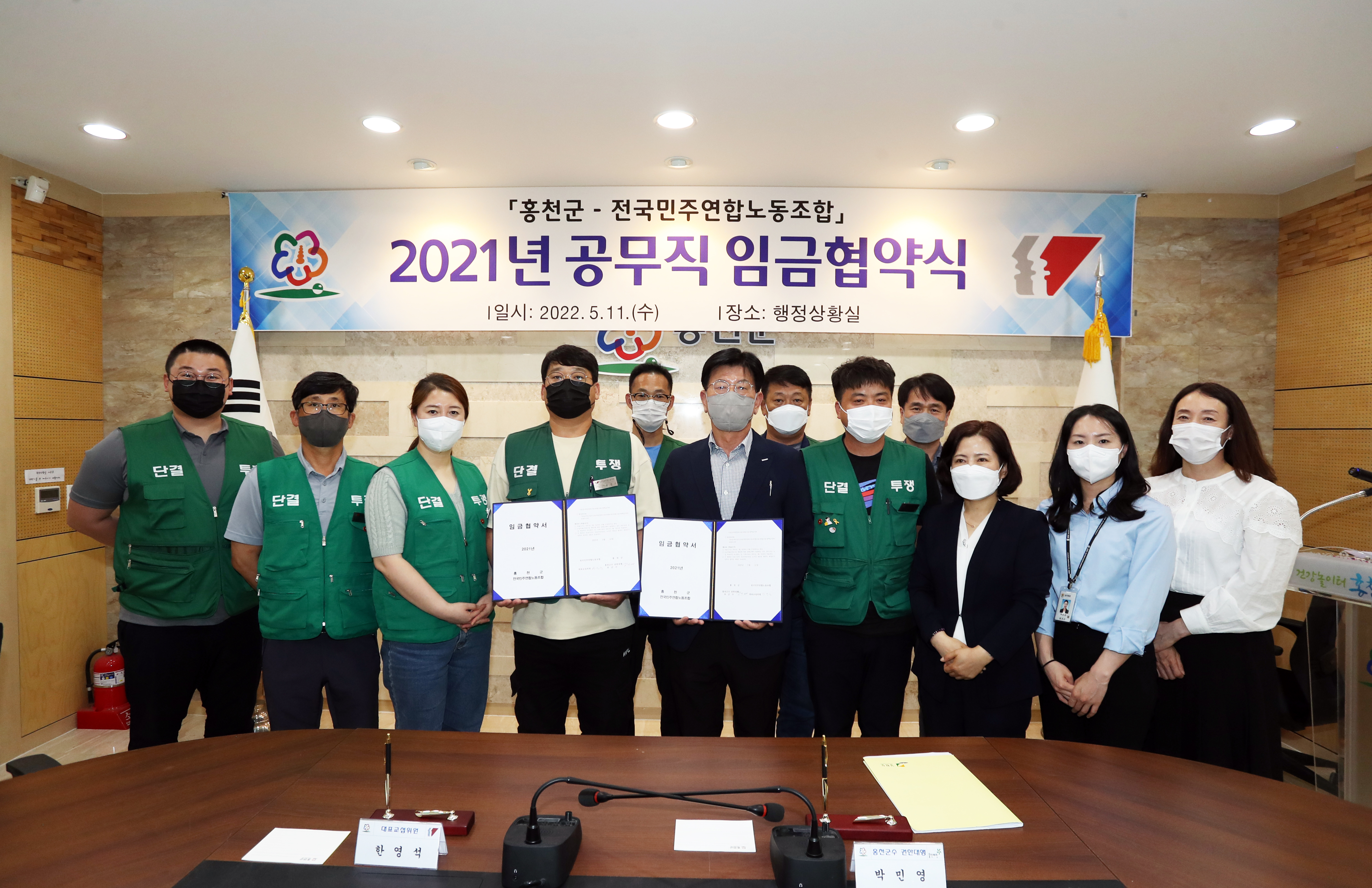[강원사회복지신문 홍기한 기자]=홍천군은 지난 5월 11일 공무직 노조(전국민주연합노동조합)와 2021년 임금 협약을 체결했다. 협약식에는 박민영 홍천군수 권한대행과 노조 측 한영석 강원경북충북본부 부본부장 등 노사 양측 교섭위원 12명이 참석했다. 이번 임금 협약에서는 지난 1월 19일 임금 협상 상견례를 시작으로 6...