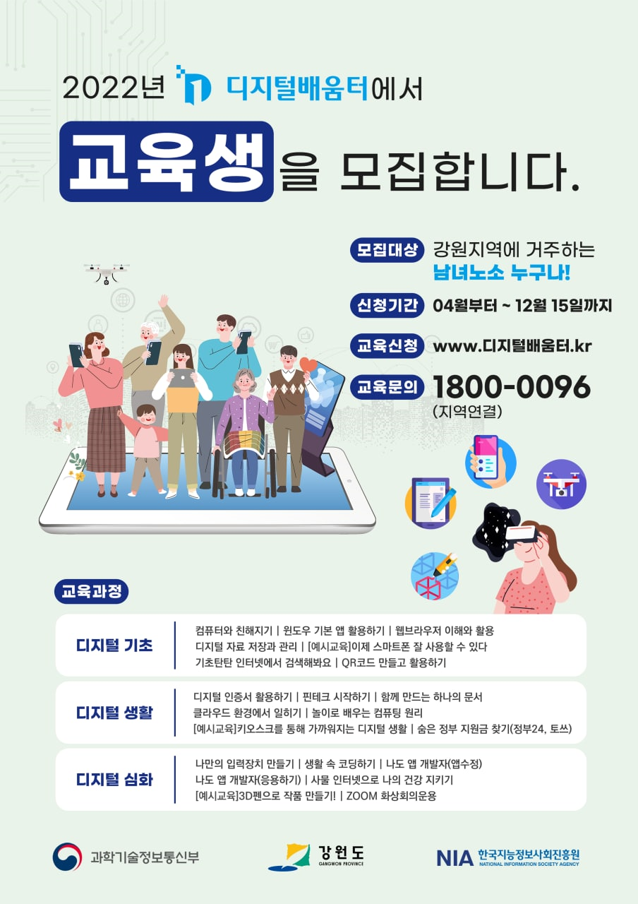 [강원사회복지신문 이정환 기자]=원주시민 누구나 무료 교육 신청, 12월 15일까지 운영 디지털배움터 집합·온라인·이동식 디지털 교육 진행 원주시는 원주시민의 디지털 역량 강화를 통해 디지털 사각지대를 해소하기 위해 '강원 디지털배움터' 교육이 진행되고 있다고 밝혔다. 12월 15일까지 원주시민이면 누구나 주 배움...
