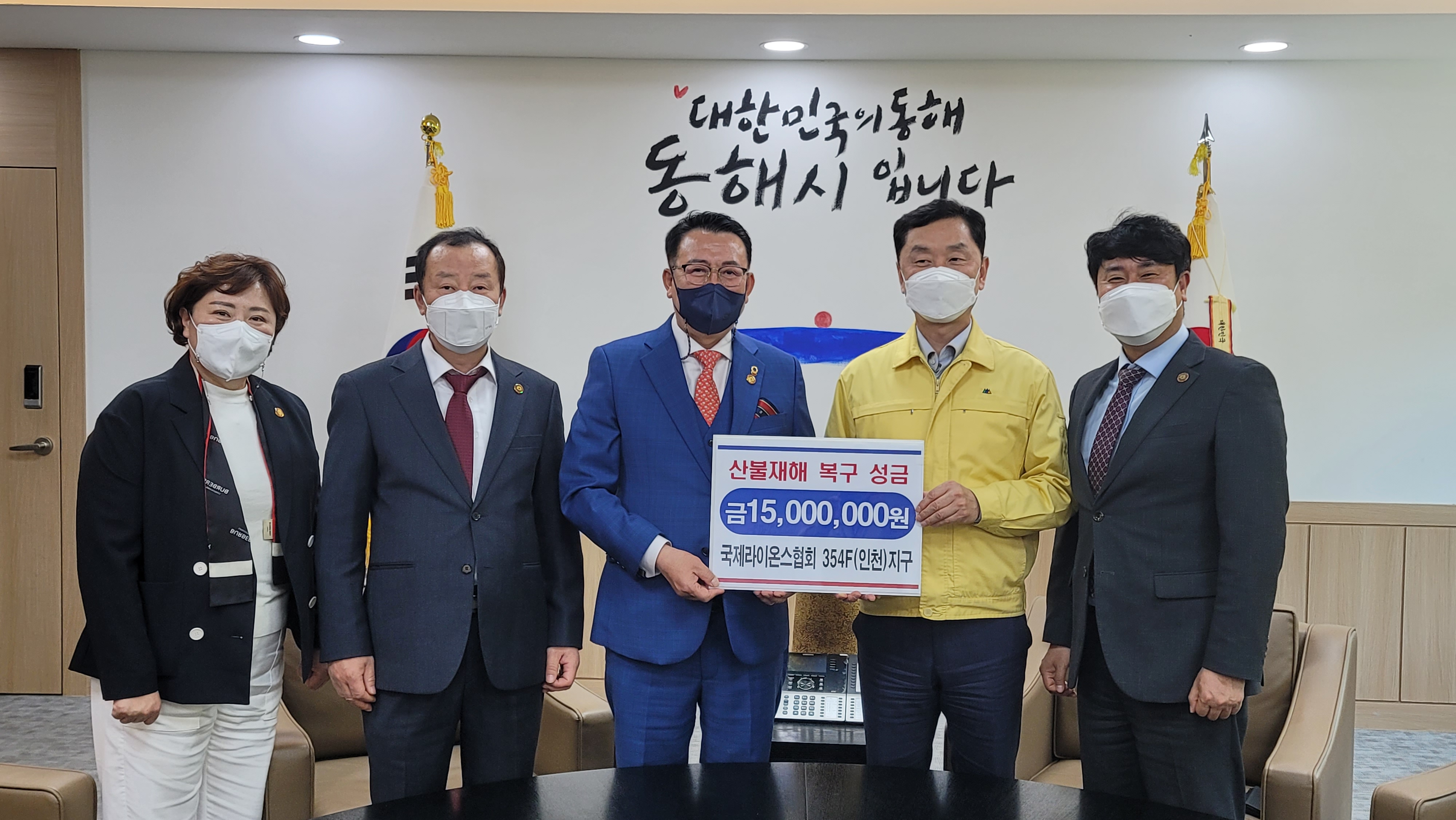 [강원사회복지신문 김종한 기자]=국제라이온스협회 354F(인천)지구에서 지난 5월 3일 동해시청을 방문해 1,500만원의 산불재해 복구 성금을 기탁했다.