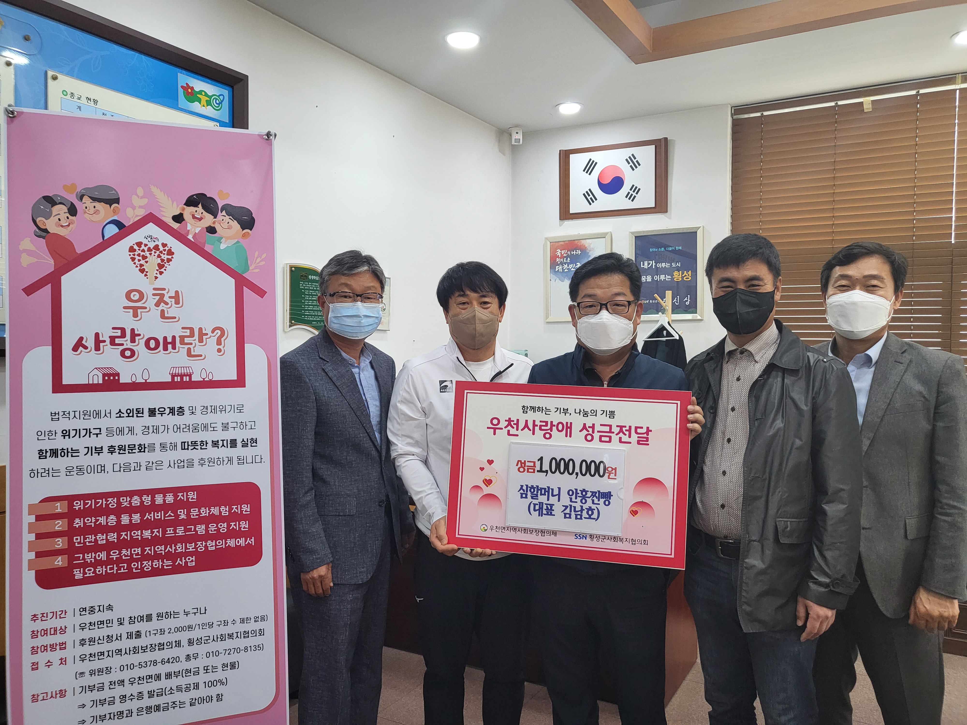 [강원사회복지신문 홍기한 기자]=횡성군 우천면 우항2리 소재 심할머니 안흥찐빵(대표 김남호)은 지난 5월 2일 우천면행정복지센터를 방문해 어려운 이웃을 위해 써달라며 성금 100만원을 기탁했다.