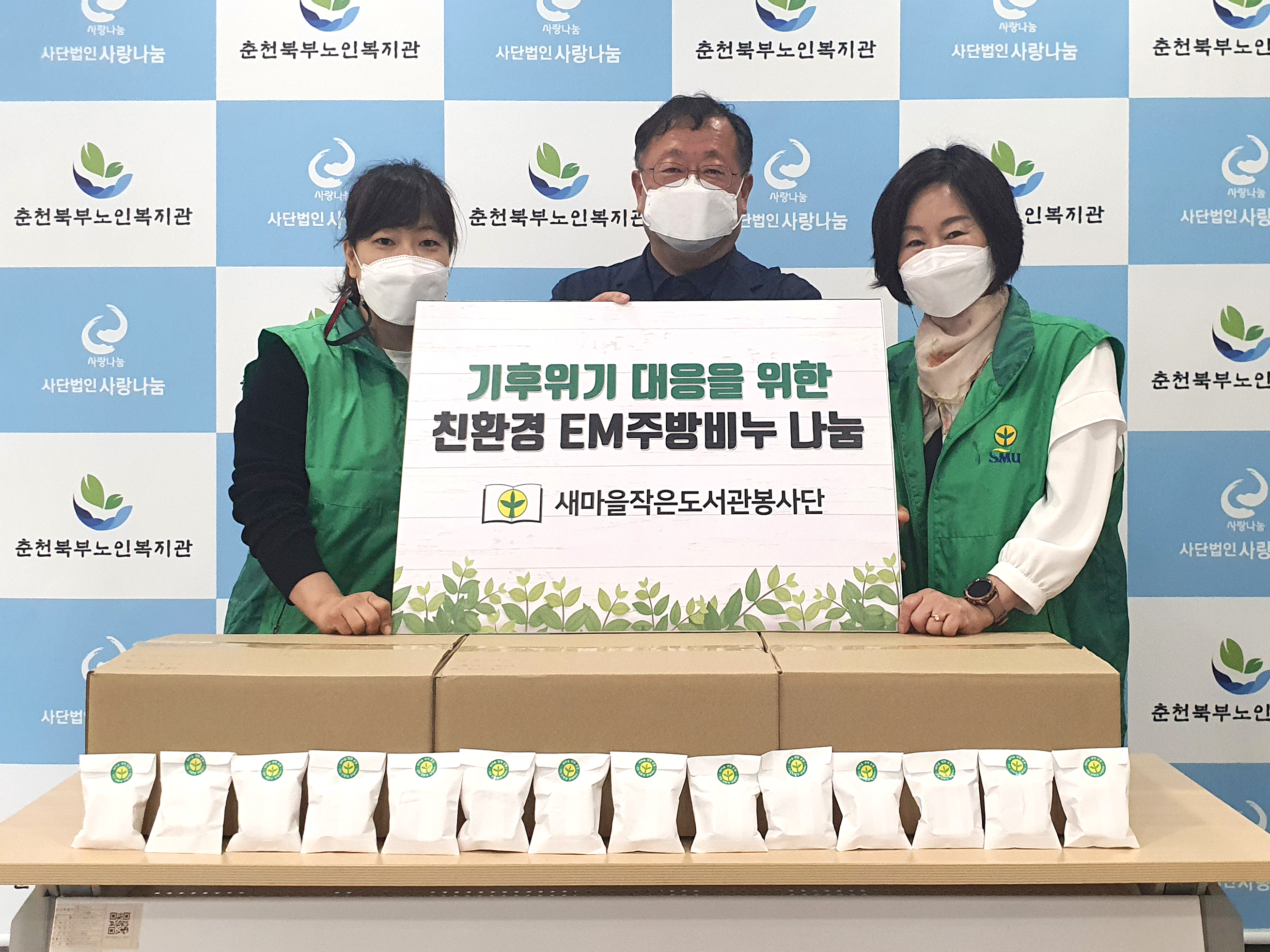 [강원사회복지신문 서은진 기자]=새마을문고중앙회 춘천시지부(회장 이희순) 새마을작은도서관봉사단은 지난 4월 25일 기후위기 대응을 위한 친환경 EM주방비누 300개를 지역사회 취약계층 지원을 위해 춘천북부노인복지관(관장 박재호) 측에 전달했다. 전달된 EM주방비누는 지역사회 위기독거어르신들과 맞춤돌봄서비스 대상...