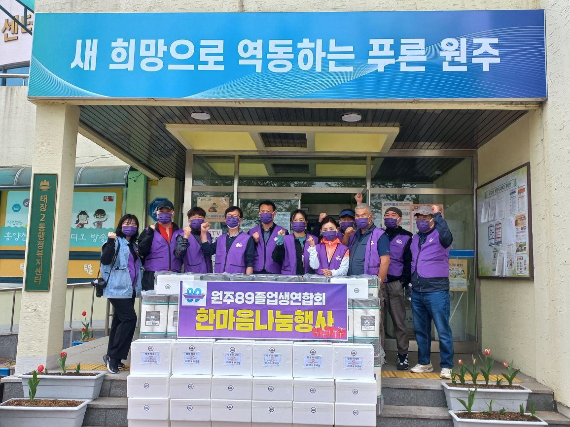 [강원사회복지신문 서은진 기자]=원주89졸업생연합회(회장 한재희)는 가정의 달을 맞아 지난 4월 24일 원주시 태장2동행정복지센터에서 지역 소외계층을 위한 '한마음 나눔 행사'를 개최했다. 이날 회원들은 정성껏 마련한 양념육 1kg 및 두루마리 휴지 30롤을 소외계층 30가구에 직접 전달했다. 이번 행사를 주최한 원주89졸...