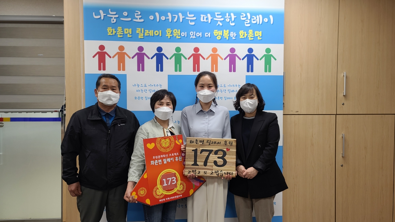 [강원사회복지신문 홍기한 기자]=홍천군 화촌면 지역사회보장협의체가 후원문화 확산을 위해 진행하고 있는 '화촌면 릴레이 후원'에 故이영자 어르신의 유족들이 173번째 주자로 참여했다. 화촌면에 거주하는 심순복씨는 모친 故이영자 어르신을 대신해 지난 4월 7일 화촌면 행정복지센터를 방문, 어려운 이웃돕기에 사용해 ...
