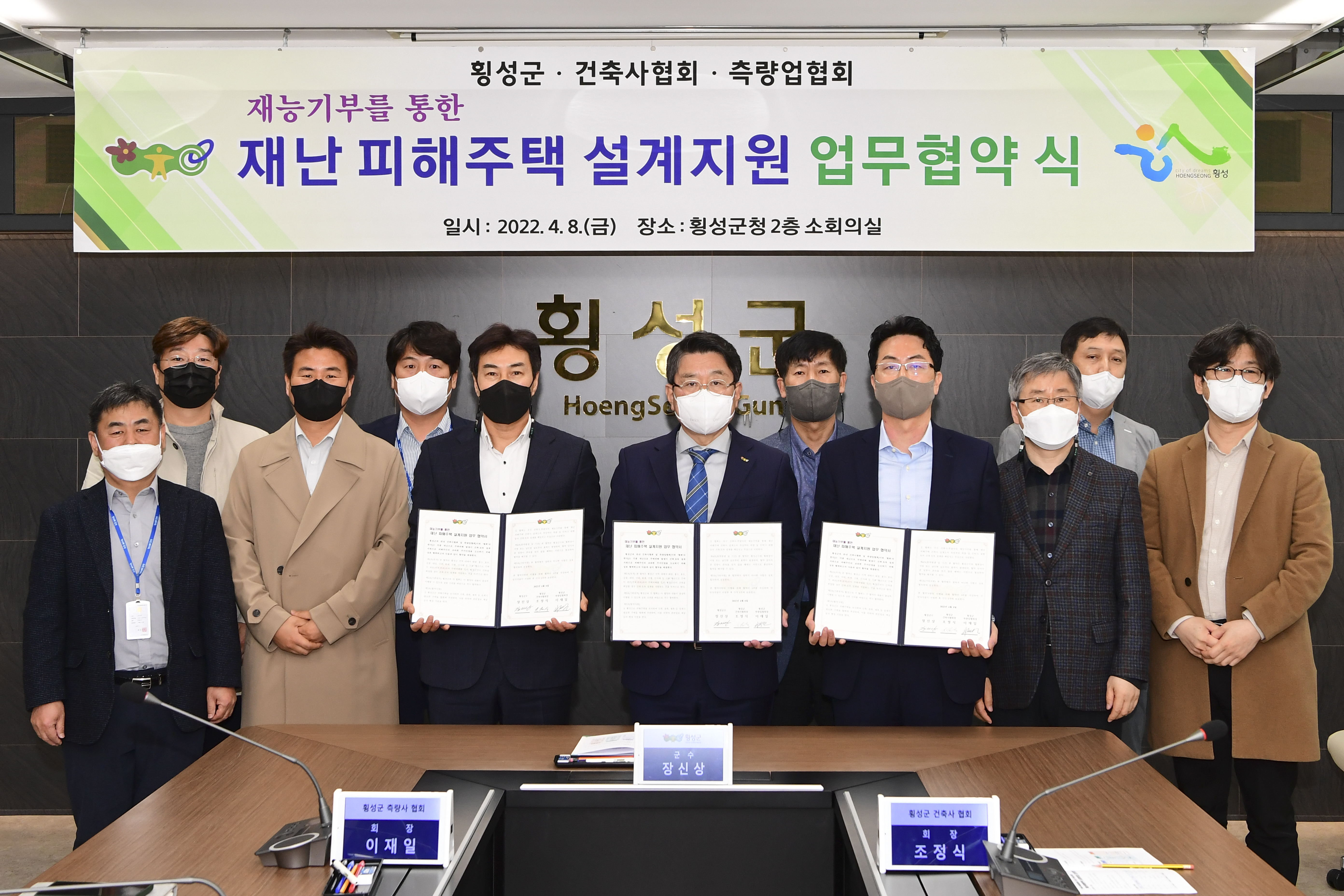 [강원사회복지신문 홍기한 기자]=재난 피해주택의 신속한 복구를 위한 건축·토목 설계 무료 지원 횡성군은 지난 4월 8일 오전 9시 30분, 군청 소회의실에서 횡성지역 건축사협회(회장 조정식), 측량업협회(회장 이재일)와 재능기부를 통한 재난 피해주택 설계지원 업무협약을 체결하였다. 이번 협약은 재난 피해주택 주민에...