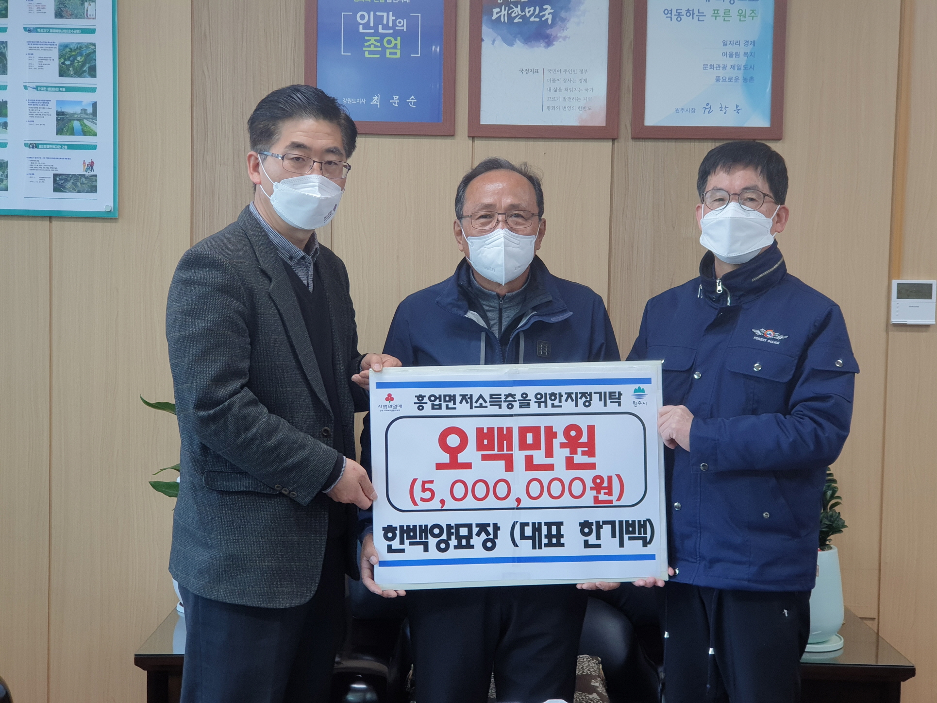 [강원사회복지신문 서은진 기자]=한백양묘장(대표 한기백)은 지난 4월 7일 원주시 흥업면 행정복지센터를 방문해 저소득층 가구를 위한 성금 500만 원을 지정 기탁했다. 흥업면 흥업리 흥대마을에 있는 한백양묘장은 묘목을 기르고 판매하는 곳으로, 산림묘목과 낙엽송, 소나무 등을 취급하고 있다.