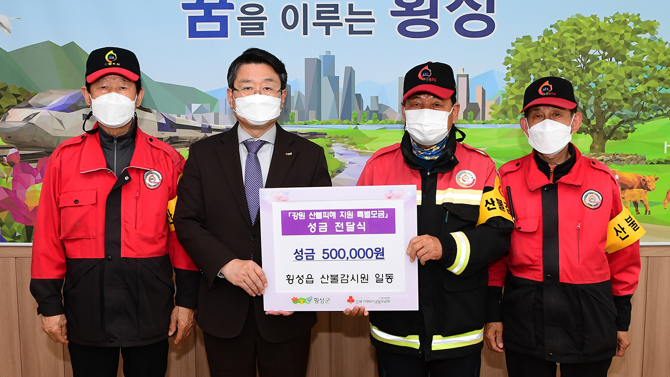 [강원사회복지신문 홍기한 기자]=횡성군 횡성읍 산불감시원(반장 태규한 외 19명)은 지난 4월 6일 오후 2시 30분, 군수집무실을 방문하여 '강원 산불피해 지원 특별 모금' 성금 50만원을 전달하였다. 이날 전달식에는 반장 태규한 및 산불감시원 남광우, 신영선님이 참석하였다. 전달된 성금은 강원도사회복지공동모금회를 통...