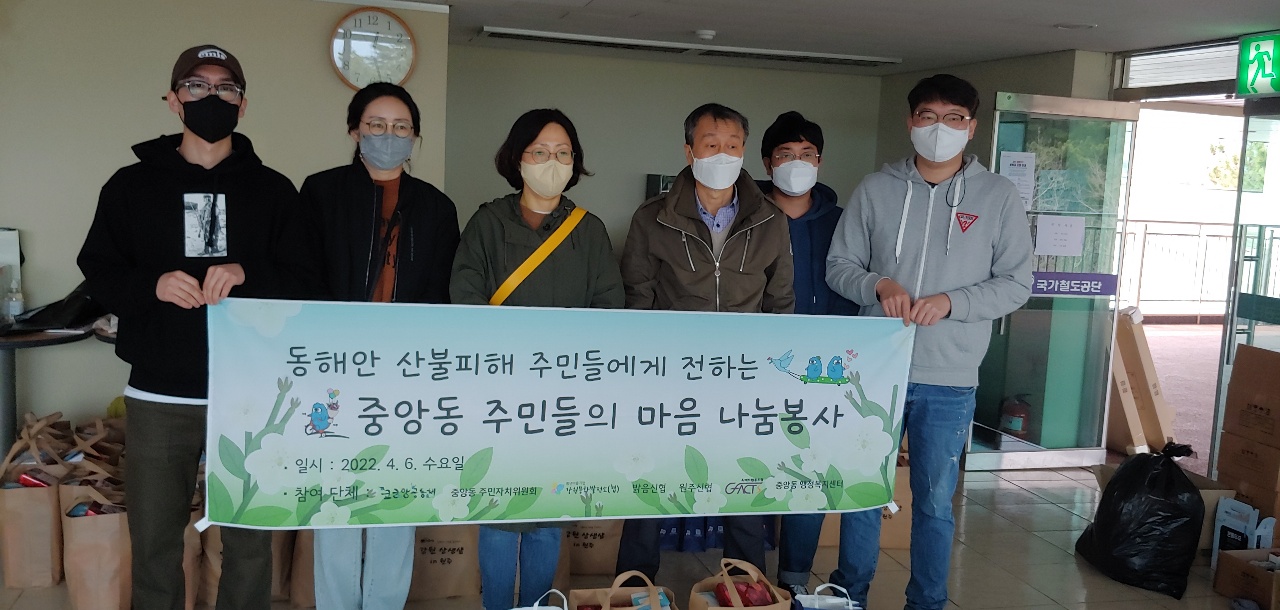 [강원사회복지신문 이정환 기자]=원주시 중앙동주민자치위원회(위원장 황승룡)는 지난 4월 6일 동해시를 방문해 산불피해 지역 이재민을 위문했다. 이날 위원들은 동해시 망상수련원을 찾아 수건과 비누, 치약, 물티슈 등 생필품과 생수, 음료 등 700만 원 상당의 구호 물품을 전달하면서 이재민들을 따뜻하게 위로했으며, 피...