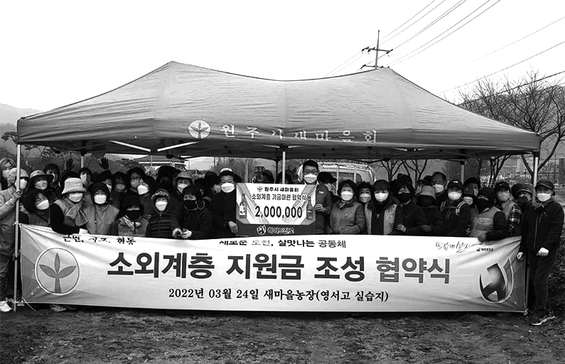 [강원사회복지신문 서은진 기자]=(사)원주시새마을회(회장 이민선)는 지난 3월 24일 원주시 관설동 새마을농장에서 (주)하이트진로 원주지점(지점장 배장희)과 소외계층 지원금 조성을 위한 협약식을 개최했다. (주)하이트진로 원주지점은 협약식에서 소외계층을 위한 도시락 사업 등에 쓰일 200만 원을 지원했다. 한편, 이날...