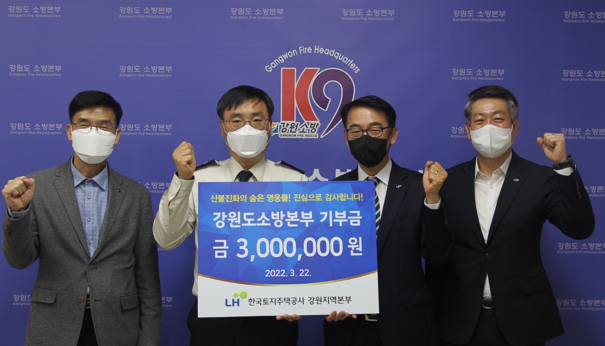 [강원사회복지신문 이정환 기자]=강원도소방본부(본부장 윤상기)는 지난 3월 22일 10시에 한국토지주택공사에서 산불진화에 헌신 노력한 소방공무원을 격려하기 위한 3백만원의 성금을 기탁하였다. 기탁식에는 김정민 한국토지주택공사 강원본부장, 윤상기 강원도소방본부장, 조영석 한국토지주택공사 경영혁신부장 등이 참석...