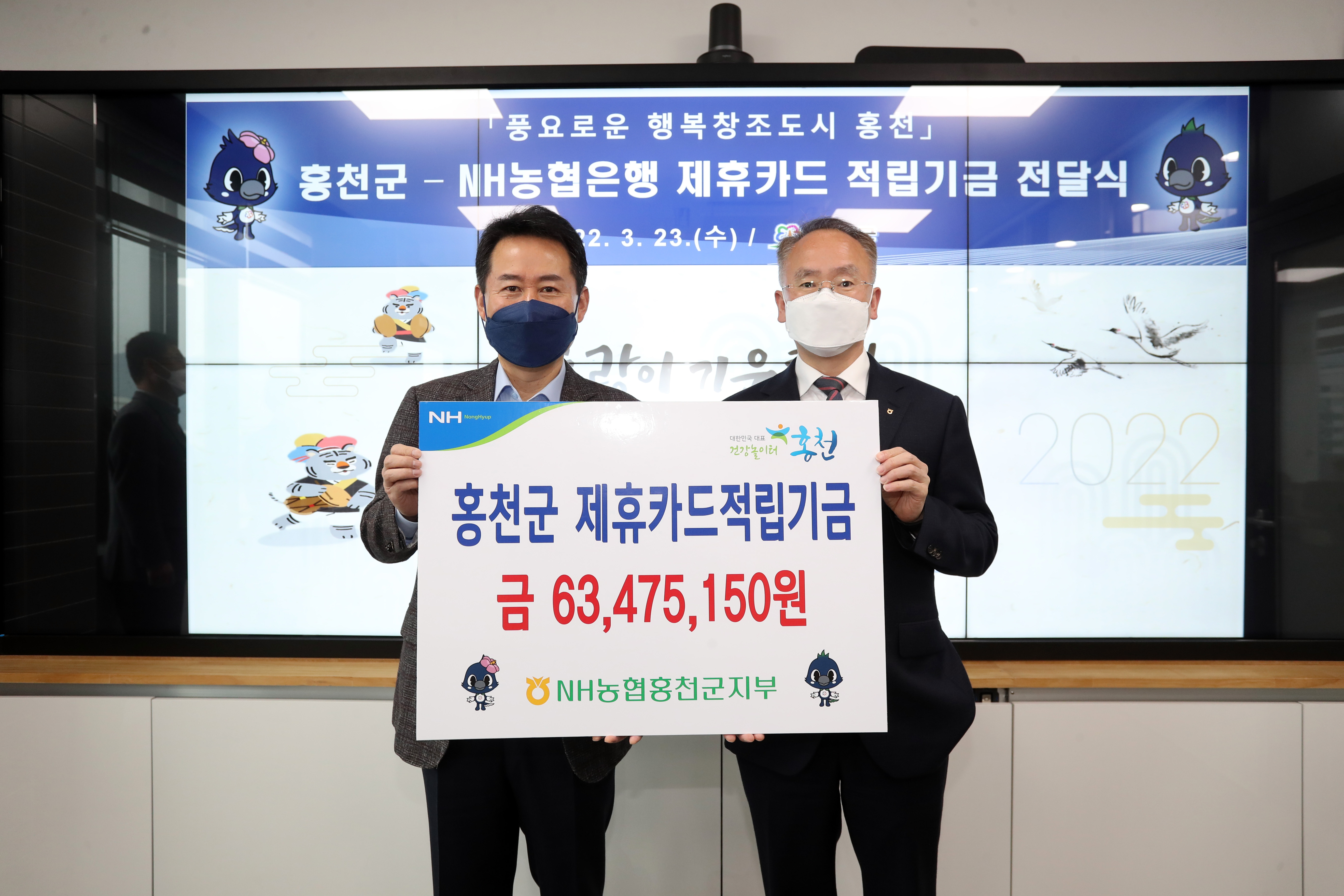 [강원사회복지신문 서은진 기자]=NH농협은행 홍천군지부(지부장 전영한)는 지난 3월 23일 홍천군청을 방문, 제휴카드 적립기금 6,300여만원을 전달했다. NH농협은행 홍천군지부는 매년 법인카드와 공무원복지카드, 보조금카드 사용금액의 일정 금액을 적립, 홍천군에 기금으로 전달하고 있다.