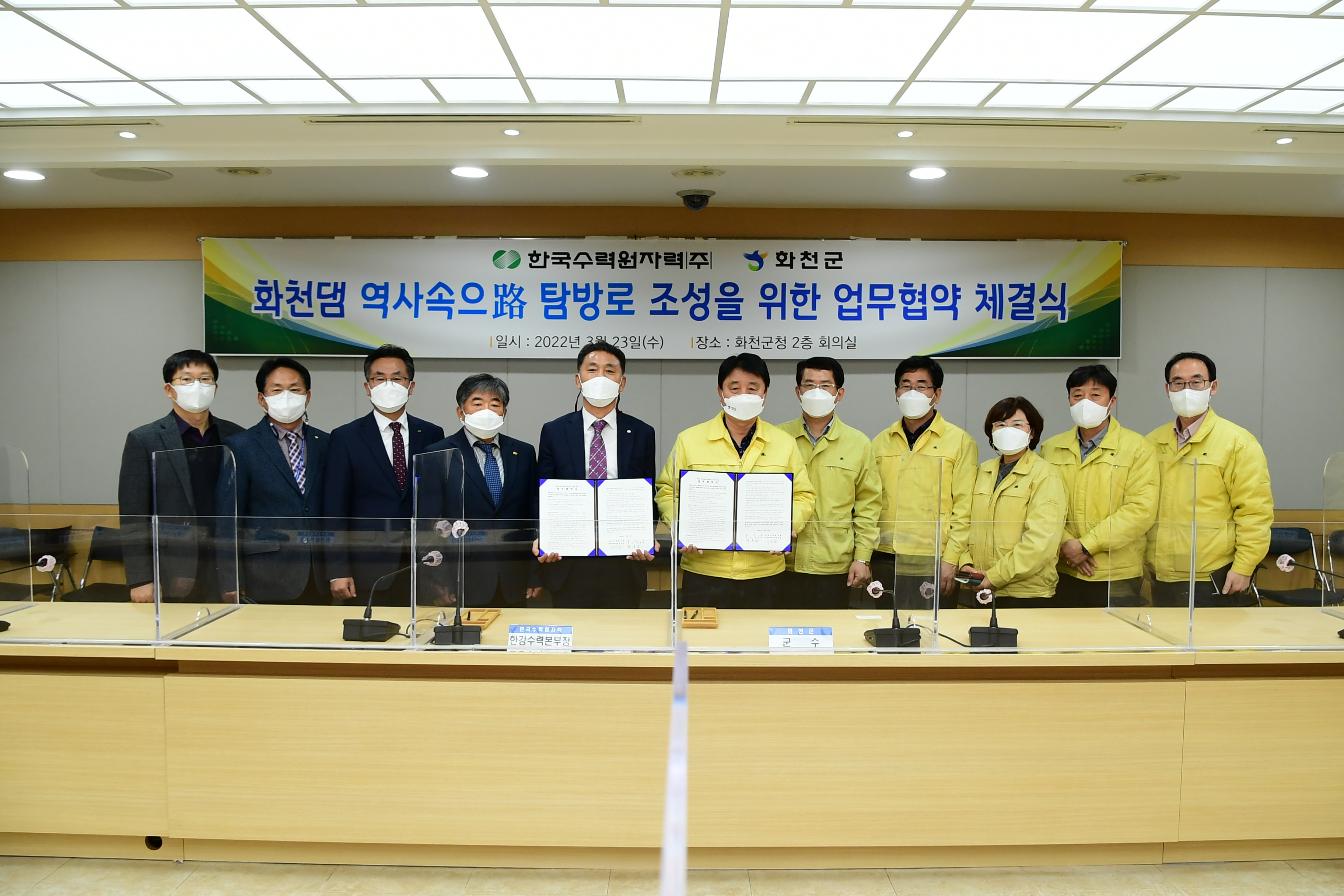 [강원사회복지신문 홍기한 기자]=화천군과 한국수력원자력(주)는 지난 3월 23일 화천군청에서 '화천댐 역사 속으로 탐방로' 조성을 위한 업무 협약식을 개최했다