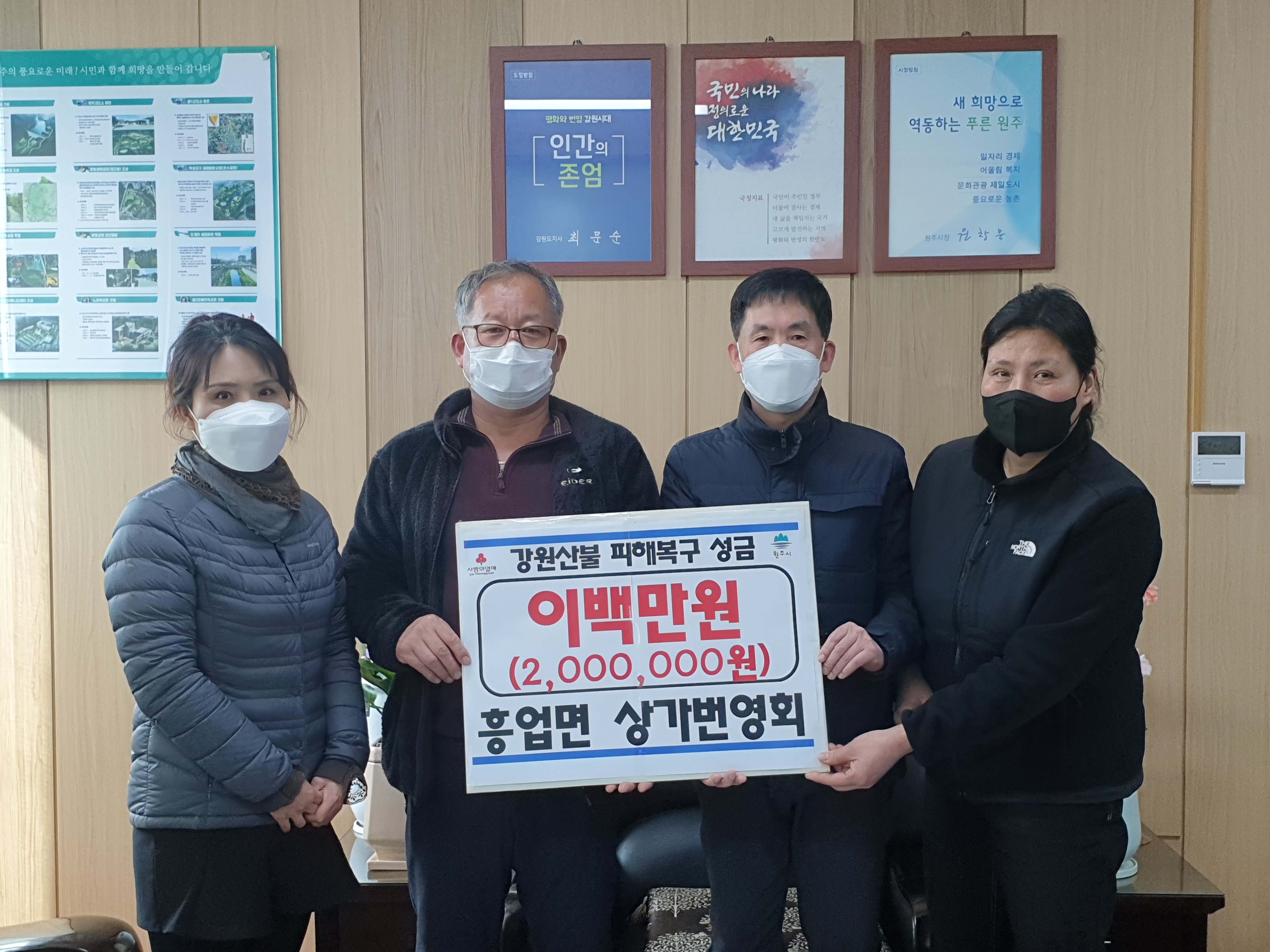 [강원사회복지신문 홍기한 기자]=원주시 흥업면 상가번영회(회장 김영섭)은 지난 3월 21일 흥업면 행정복지센터를 방문해 강원산불 피해복구 성금 200만 원을 전달했다. 성금은 사회복지공동모금회를 통해 산불 피해 지역에 지원될 예정이다.
