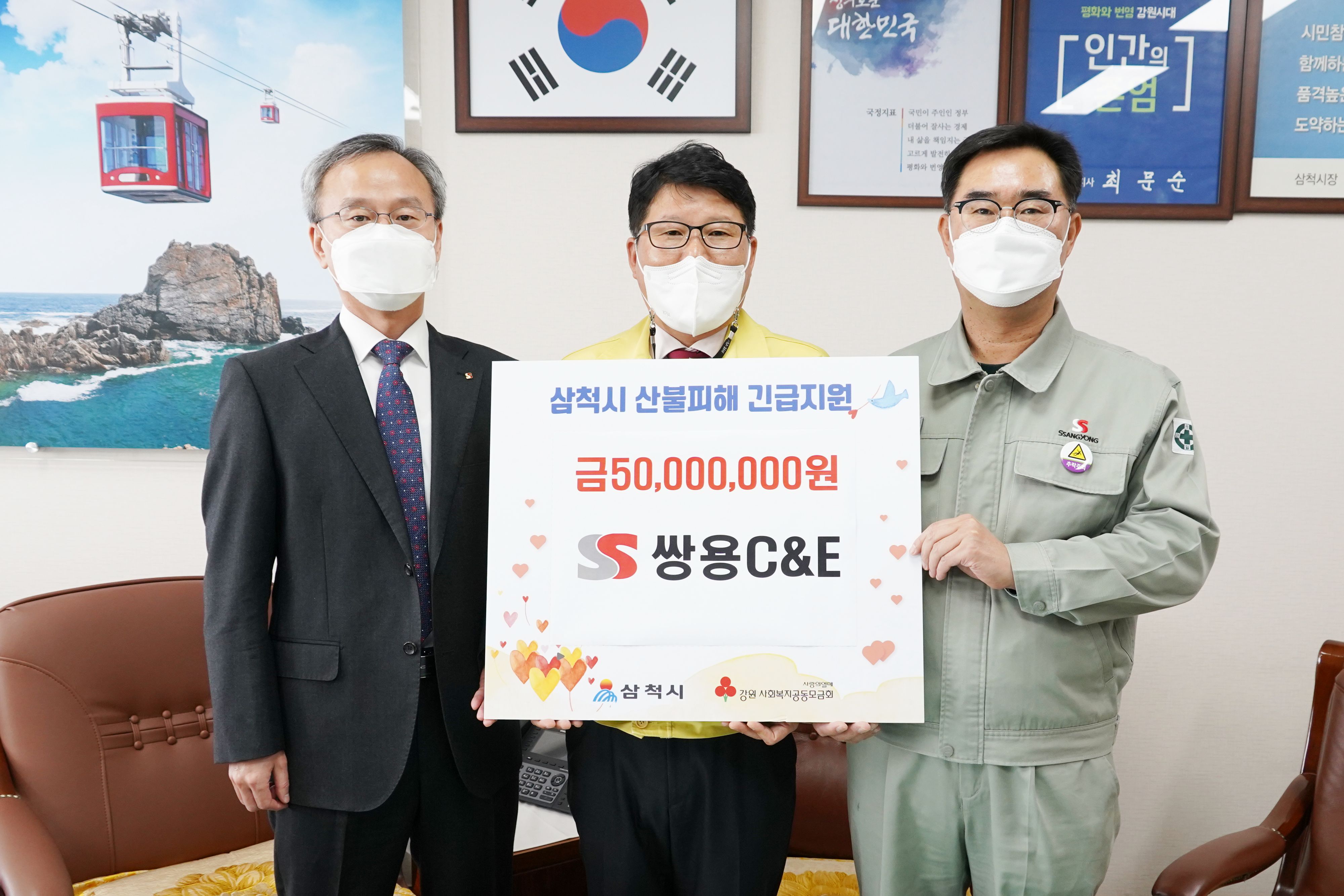 [강원사회복지신문 김종한 기자]=쌍용 C&E는 지난 3월 15일 10시 30분 삼척시 부시장 집무실에서 삼척시 산불피해 성금 5천만원을 기탁했다.
