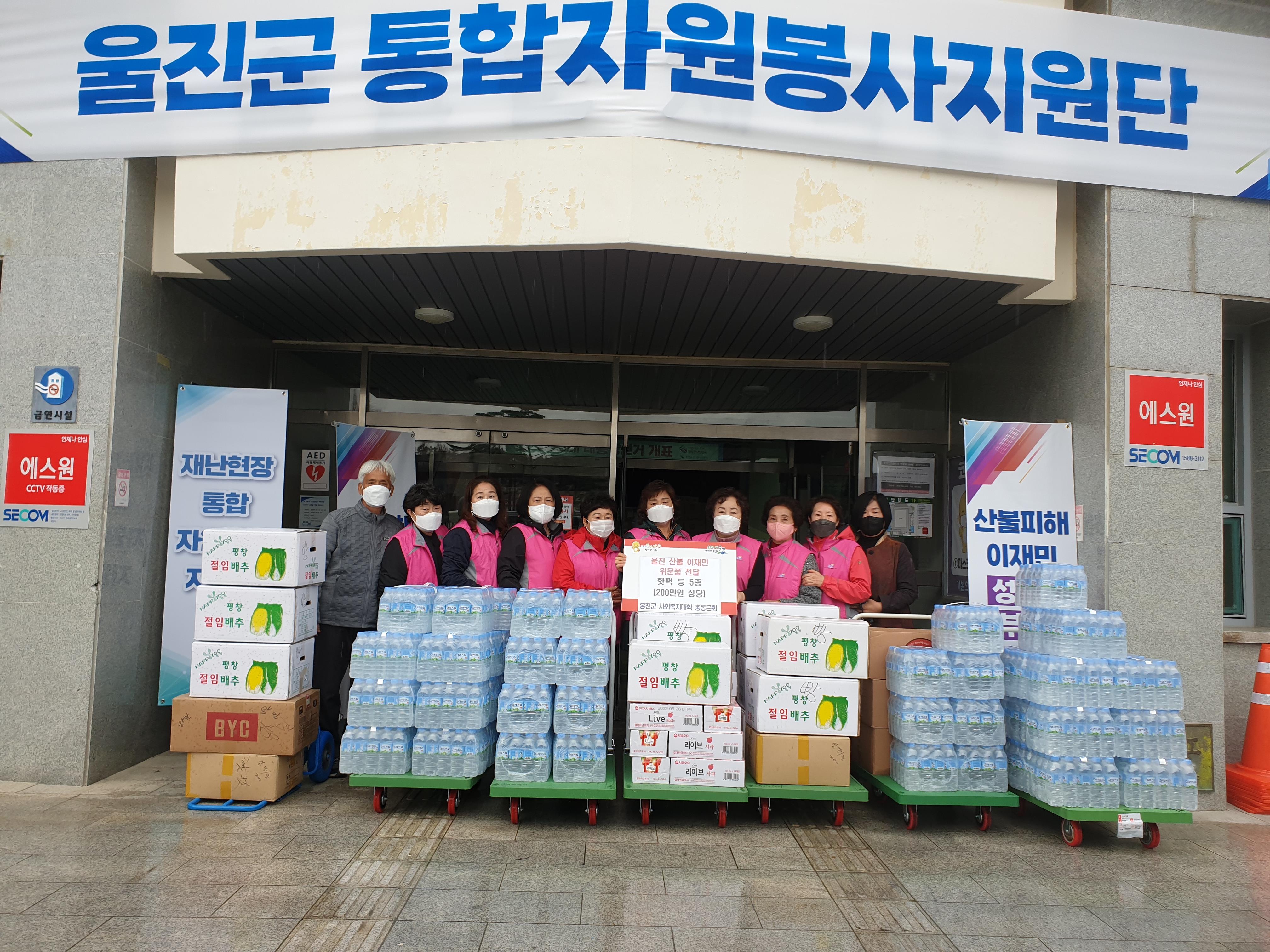 [강원사회복지신문 홍기한 기자]=홍천군사회복지대학총동문회 일동은 지난 3월 4일 발생한 대형 산불로 인해 큰 피해를 입고 특별재난지역으로 선포된 경상북도 울진군 산불피해지역을 방문하여 핫팩, 생수 등 200만원 상당의 위문품을 울진군민들에게 조금이나마 위로와 힘이 되길바라며 전달하였다.