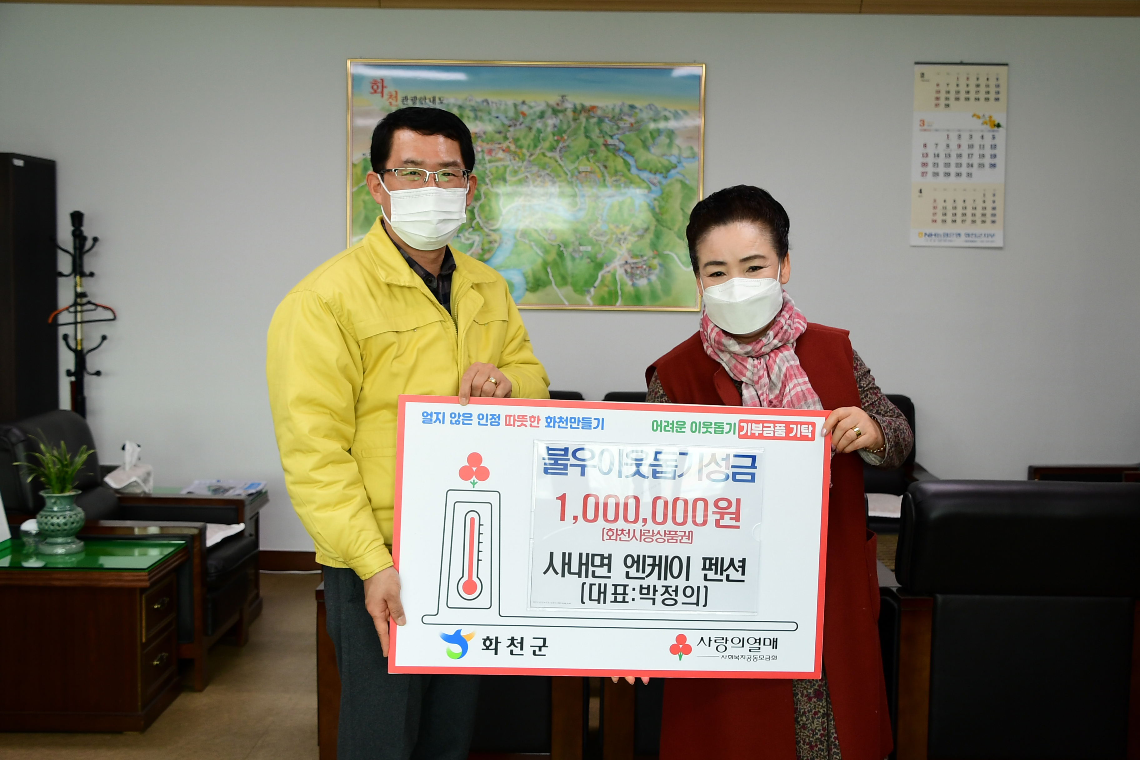 [강원사회복지신문 이정환 기자]=박정의 사내면 엔케이 펜션 대표는 지난 3월 10일 최명수 화천부군수를 방문해 어려운 이웃을 위해 써달라며 100만원 상당의 화천사랑상품권을 기탁했다.