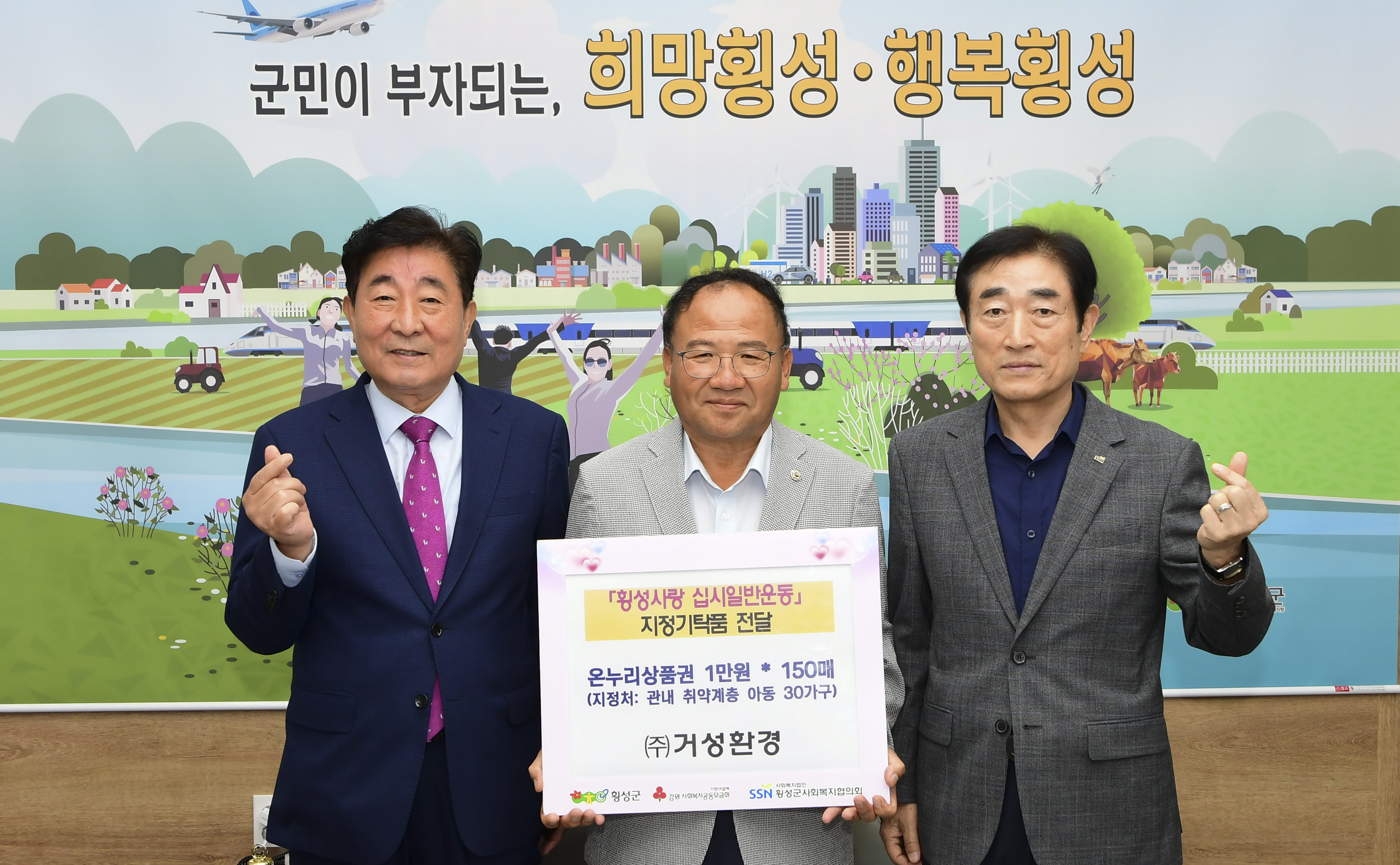 [강원사회복지신문 홍기한 기자]=(주)거성환경(대표 황영근)은 지난 9월 20일 9시 30분 군수 집무실에서 '횡성사랑 십시일반운동'에 동참하는 의미에서 온누리상품권 150만원 상당을 기탁하였다.