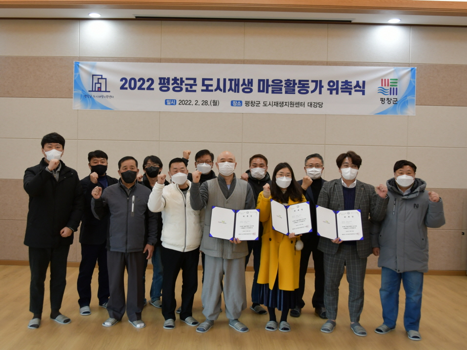 [강원사회복지신문 이정환 기자]=평창군 도시재생지원센터는 지난 2월 28일 평창읍 세대공감센터 2층 다목적실에서 마을활동가로 선정된 4명에게 위촉장을 수여했다고 밝혔다. 위촉식은 위촉장 전달 및 활동가 소감과 포부를 공유하고 도시재생지원센터장의 2022년도 도시재생 추진계획을 안내하는 일정으로 진행되었으며, 활...