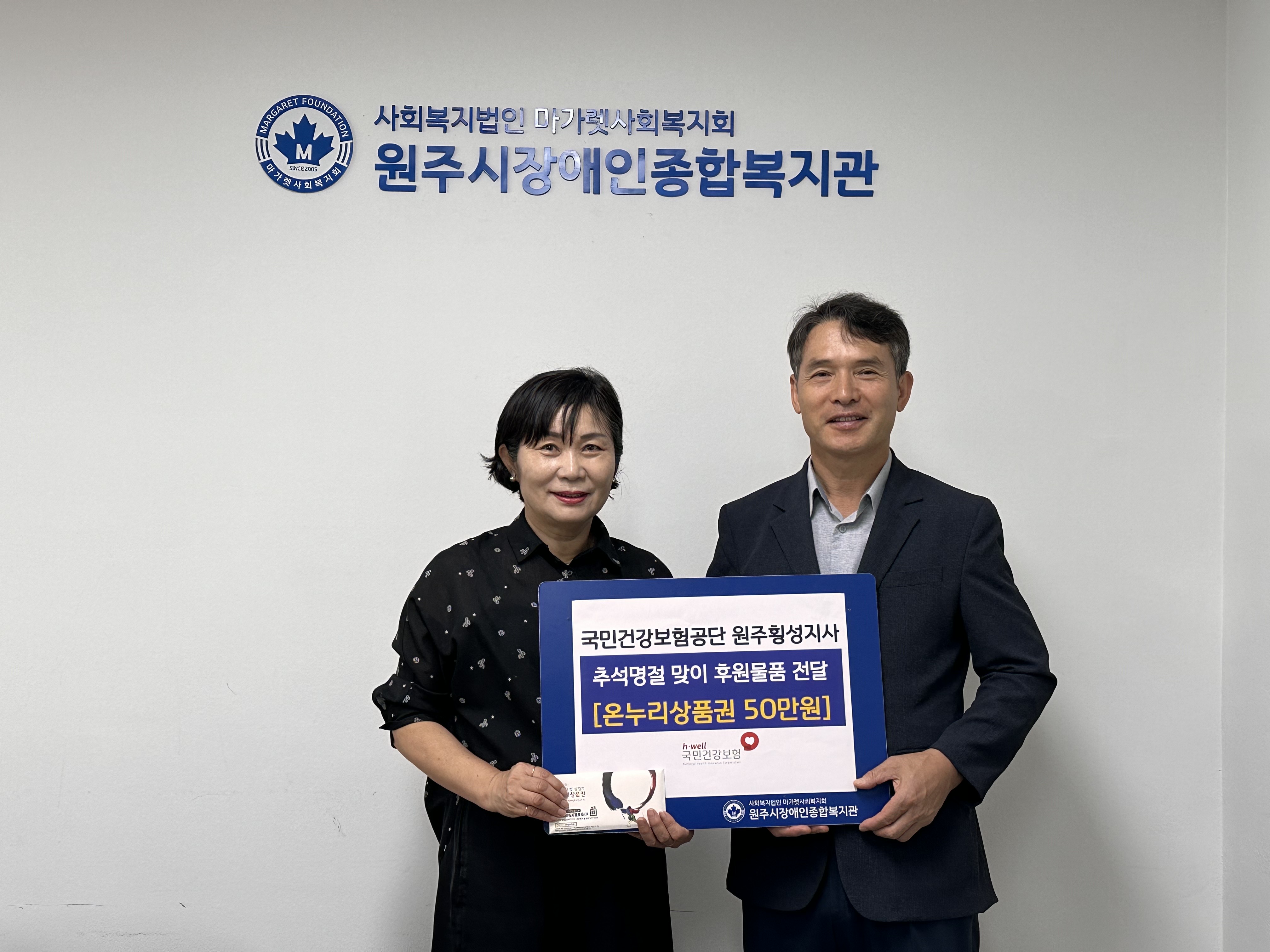 [강원사회복지신문 서은진 기자]=국민건강보험공단 원주횡성지사(지사장 정인영)은 지난 9월 20일 원주시장애인종합복지관(관장 정진애, 이하 복지관)에 추석명절맞이 후원물품 온누리상품권 50만원을 전달하였다.